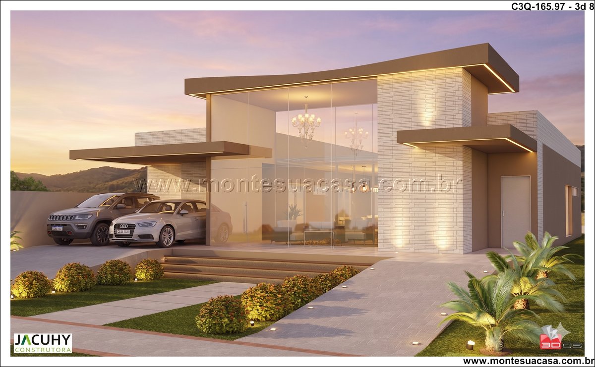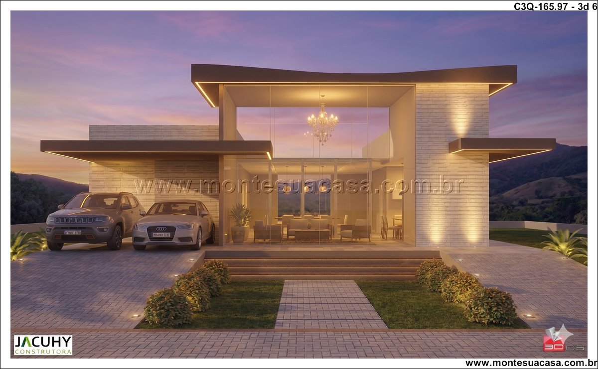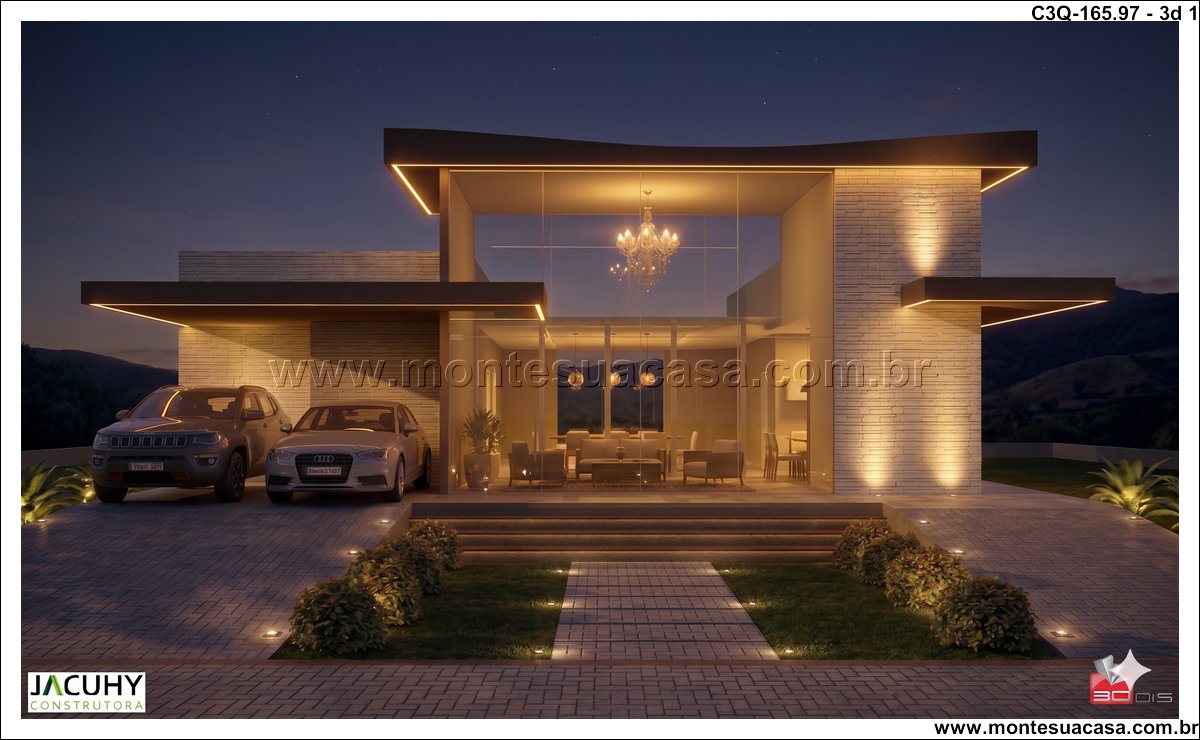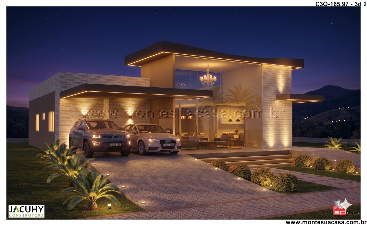 Este projeto de 165.97m² apresenta uma casa térrea moderna que valoriza linhas retas, transparência e integração completa entre os ambientes. A fachada com grandes panos de vidro cria impacto imediato e permite que a luz natural domine toda a área social. A cobertura plana e os volumes bem definidos reforçam a estética contemporânea, enquanto o recuo frontal e o paisagismo destacam a entrada principal.