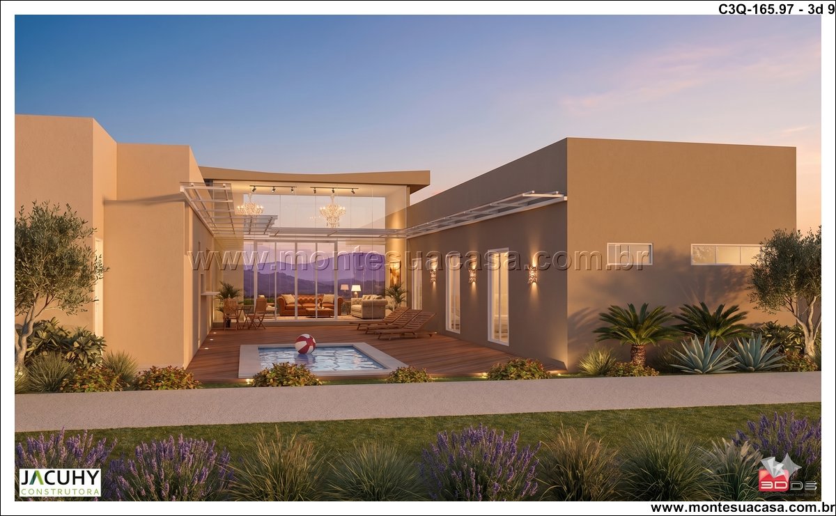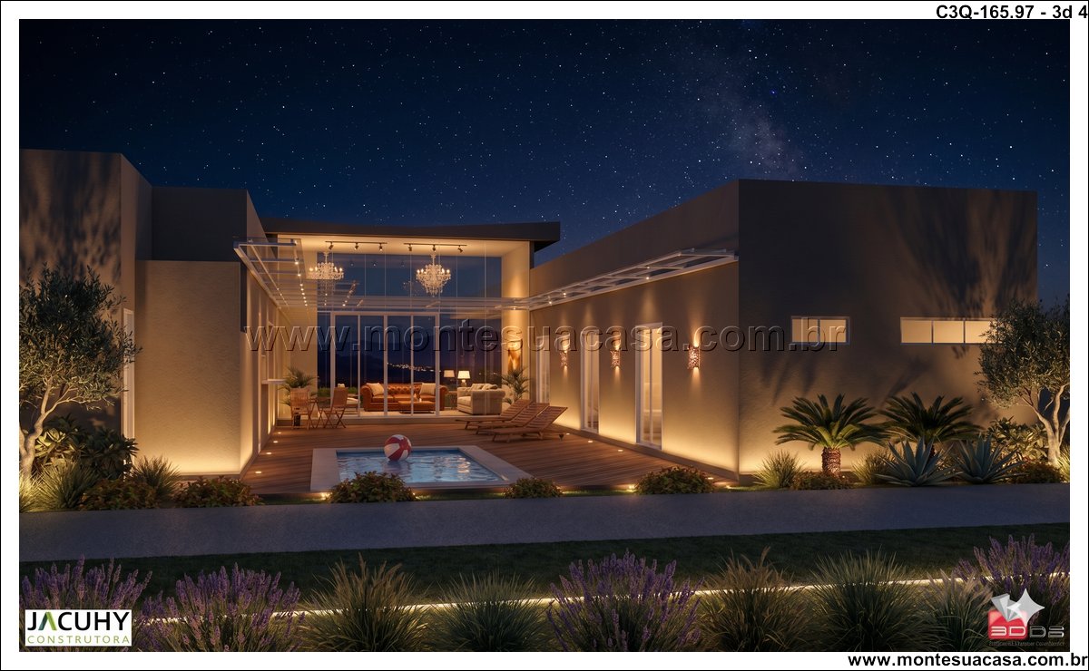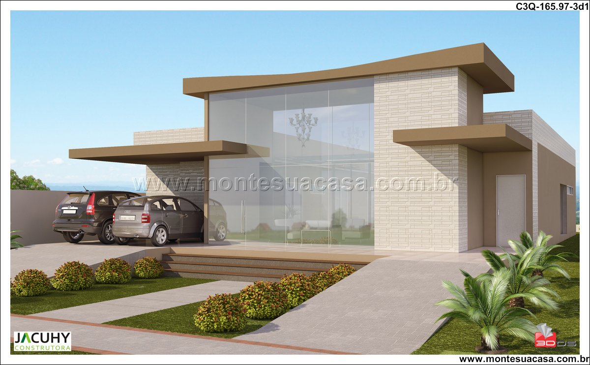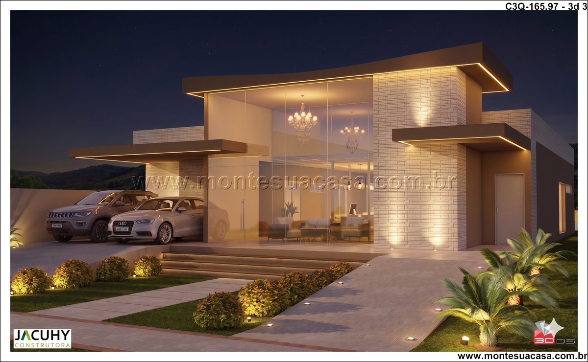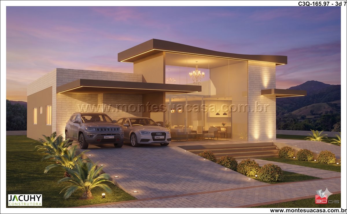 Este projeto de 165.97m² apresenta uma casa térrea moderna que valoriza linhas retas, transparência e integração completa entre os ambientes. A fachada com grandes panos de vidro cria impacto imediato e permite que a luz natural domine toda a área social. A cobertura plana e os volumes bem definidos reforçam a estética contemporânea, enquanto o recuo frontal e o paisagismo destacam a entrada principal.