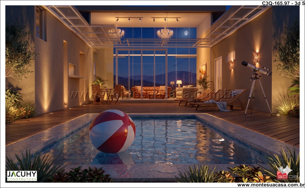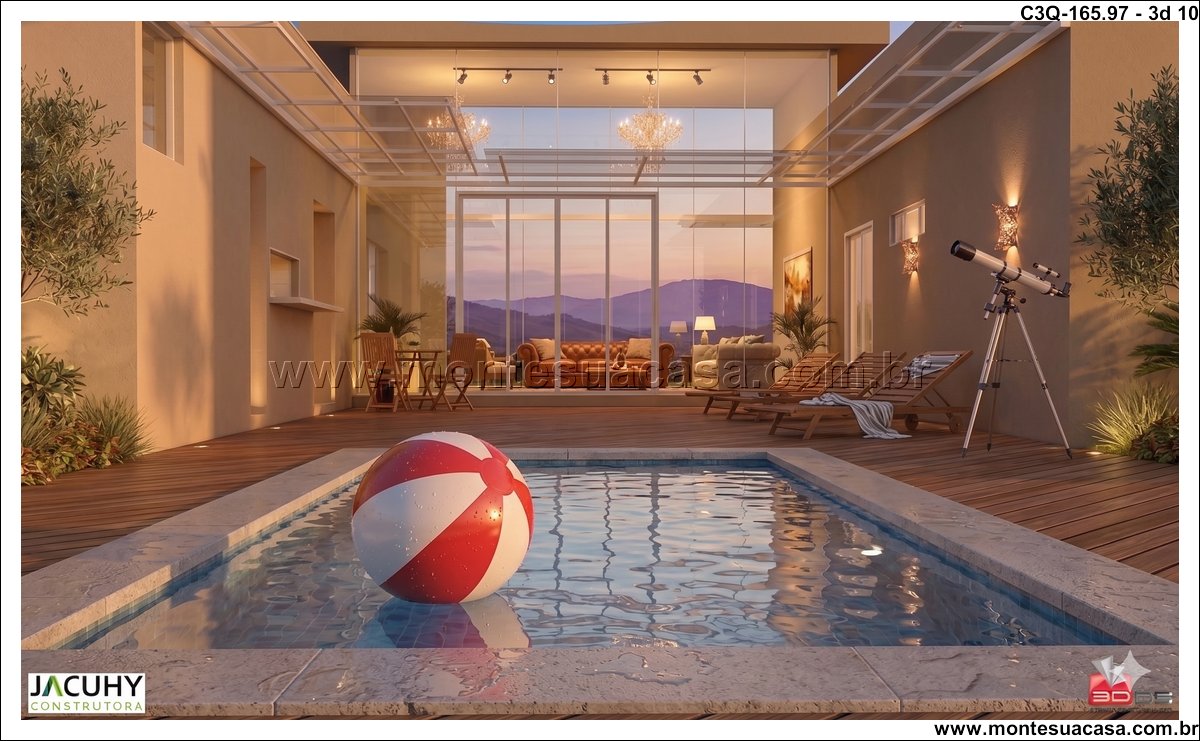 O deck central em madeira serve como eixo de conexão da casa, proporcionando charme e fluidez. A piscina de 14.95m² ocupa posição privilegiada, recebendo sol direto e permitindo circulação confortável ao seu redor. Espreguiçadeiras, cobertura leve e o espaço para refeições ao ar livre tornam o ambiente perfeito para convivência familiar. Duchas externas e banheiro exclusivo completam o conjunto, garantindo praticidade para quem usa a piscina.