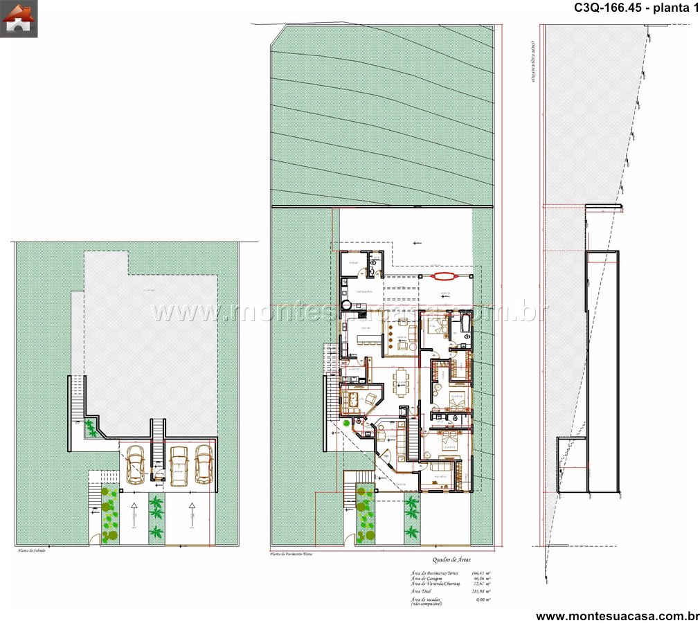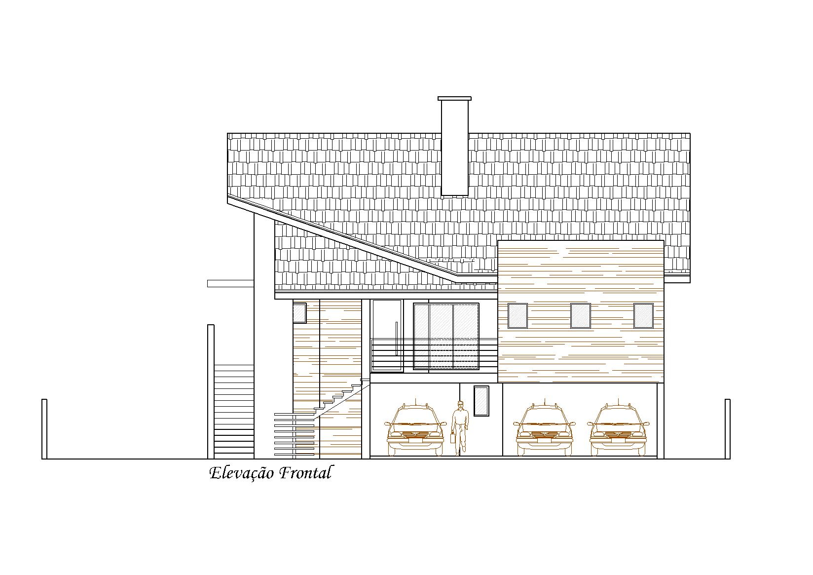 O projeto foi concebido especificamente para lotes em aclive, onde o acesso frontal fica em nível inferior aos ambientes principais. A garagem ocupa o primeiro patamar acima da rua, facilitando manobras e garantindo acesso direto. A partir desse ponto, uma escada leva ao pavimento superior, onde toda a área residencial se desenvolve de forma linear e funcional. Essa solução aproveita a topografia e evita cortes excessivos no terreno, permitindo economia na obra e melhor integração da casa ao lote.