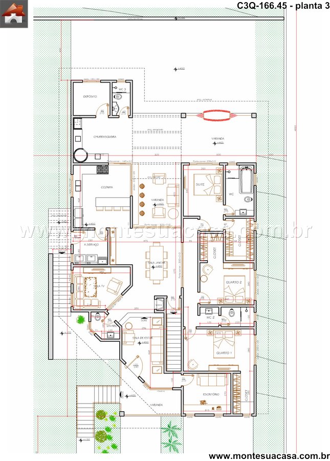 O pavimento superior abriga ainda lavanderia, despensa, escritório e sala de TV, organizados de forma clara para simplificar o uso diário. O escritório ganhou posição frontal privilegiada, ideal para quem trabalha em casa e precisa de concentração. O acesso interno à varanda frontal e aos jardins laterais melhora ainda mais a circulação e distribui luz natural por todo o conjunto.