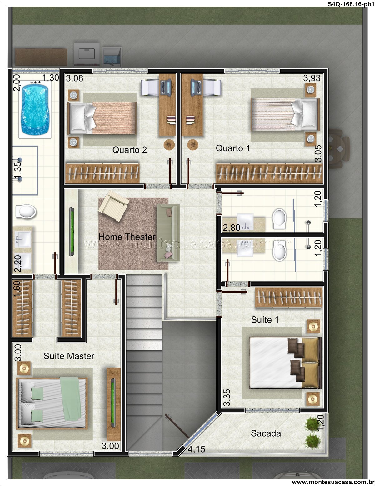 O pavimento superior abriga os quatro quartos, sendo uma suíte master com generosos 3,35m² e sacada privativa. Os demais quartos, incluindo o quarto 1 de 2,80m² e o quarto 2 de 3,03m², oferecem conforto e privacidade para todos os moradores. A disposição estratégica dos dormitórios garante tranquilidade e descanso.