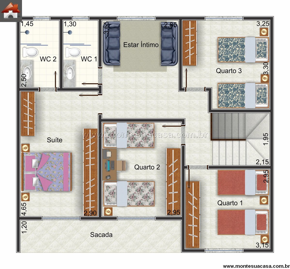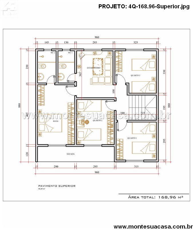 No andar superior, o projeto conta com quatro dormitórios, sendo um deles uma suíte espaçosa com varanda privativa. Os quartos 1, 2 e 3 compartilham dois banheiros sociais, garantindo conforto para toda a família. O destaque deste pavimento é o estar íntimo, ideal para momentos tranquilos, leitura ou lazer em família.
