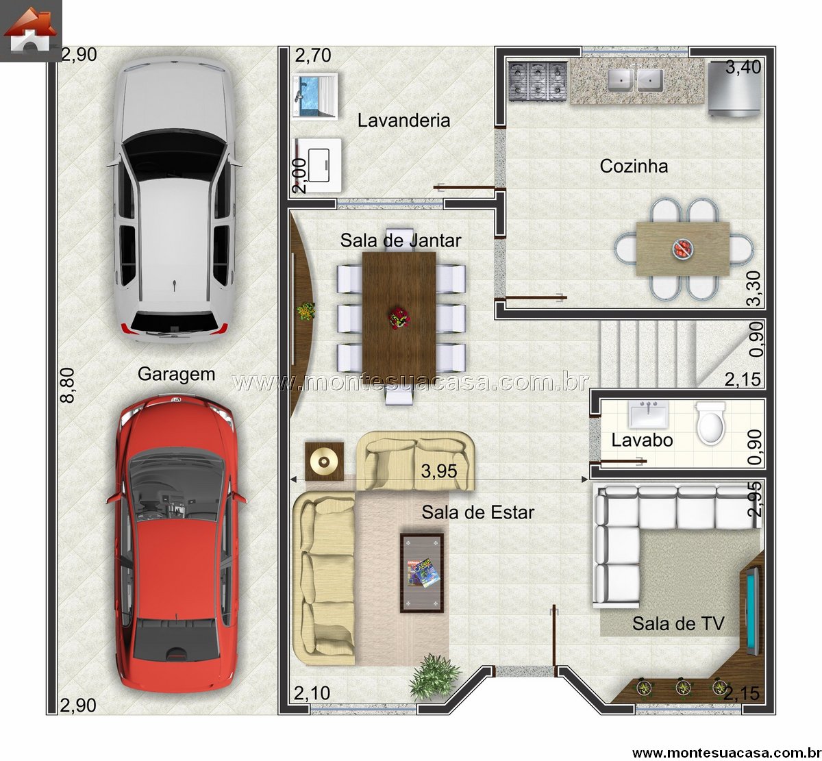A lavanderia possui acesso direto à área externa, oferecendo praticidade nas tarefas diárias. Um lavabo bem posicionado complementa o pavimento, tornando o uso diário mais funcional. A garagem coberta para dois carros reforça o caráter prático e moderno da residência.