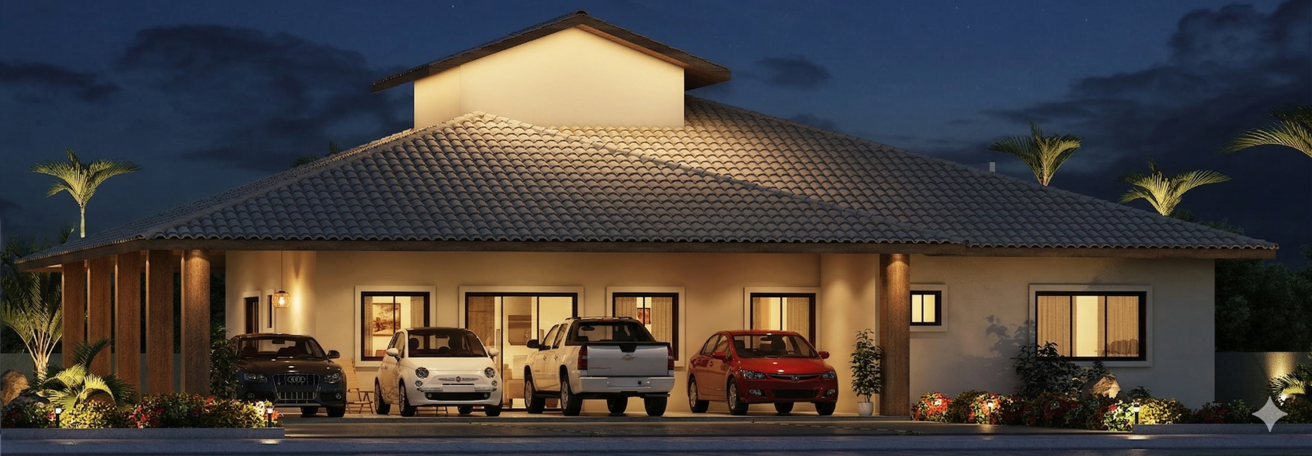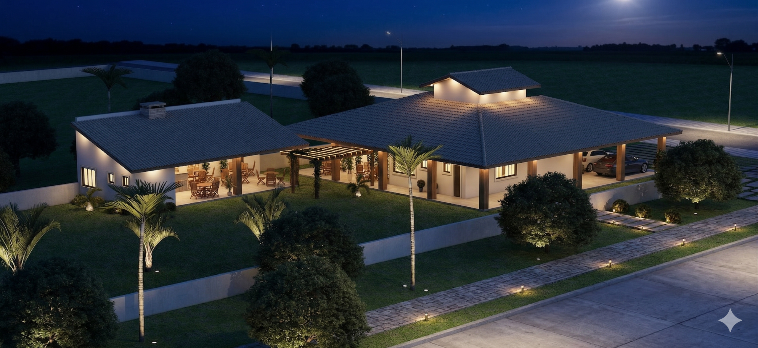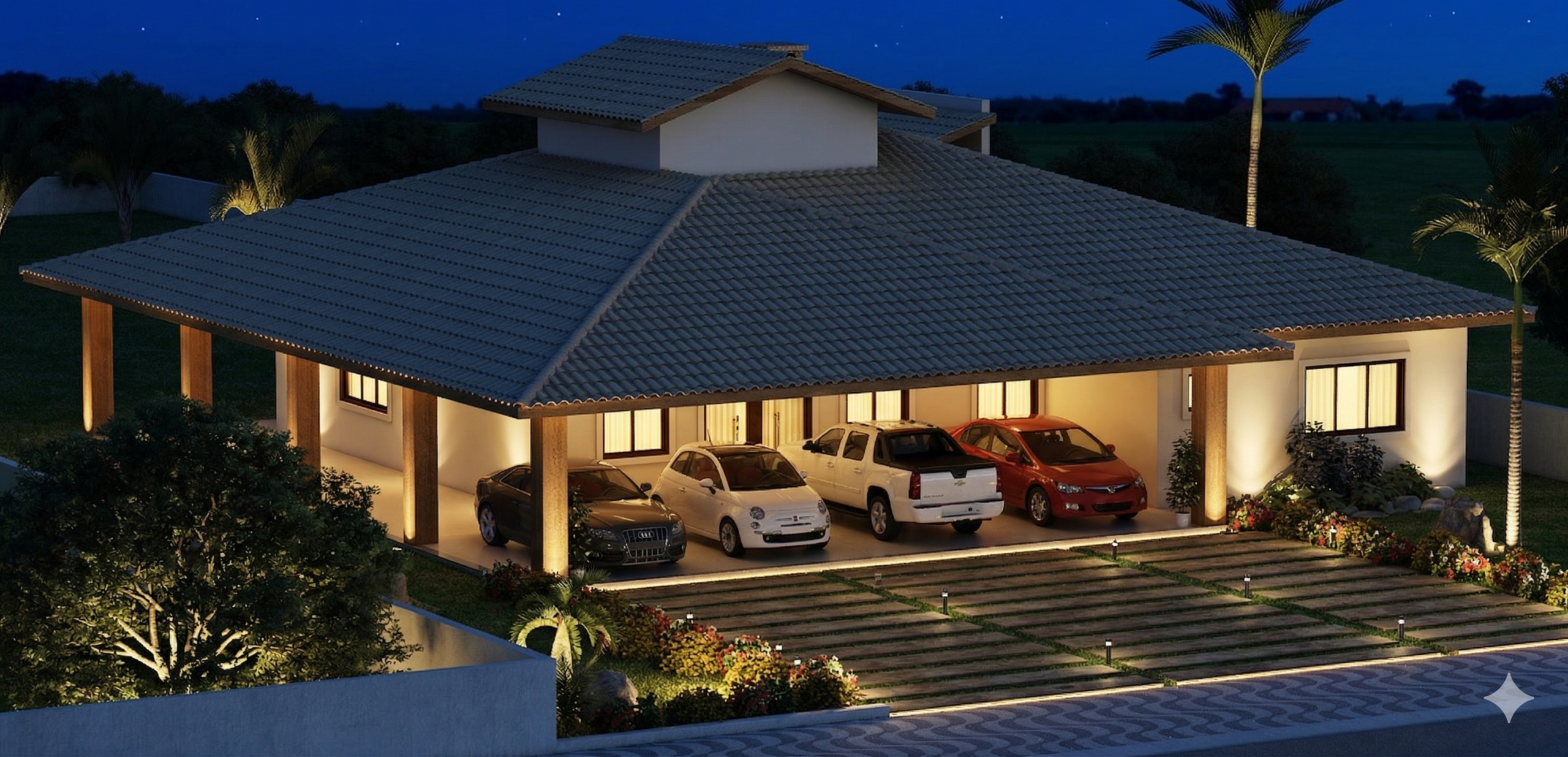 A fachada combina elementos tradicionais com toques contemporâneos, marcada pelo telhado imponente e pelas colunas em madeira que sustentam o alpendre. A garagem coberta comporta até quatro veículos, protegendo-os das intempéries e valorizando a fachada da residência. O paisagismo frontal complementa o visual, adicionando charme e equilíbrio à composição.