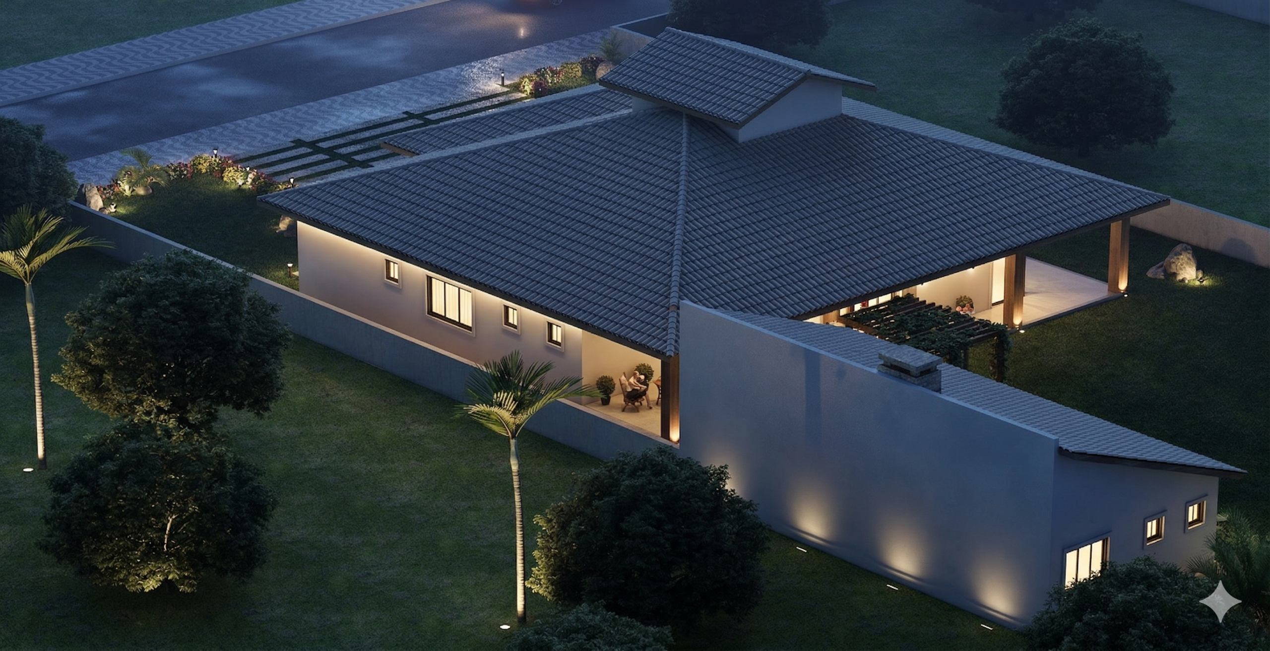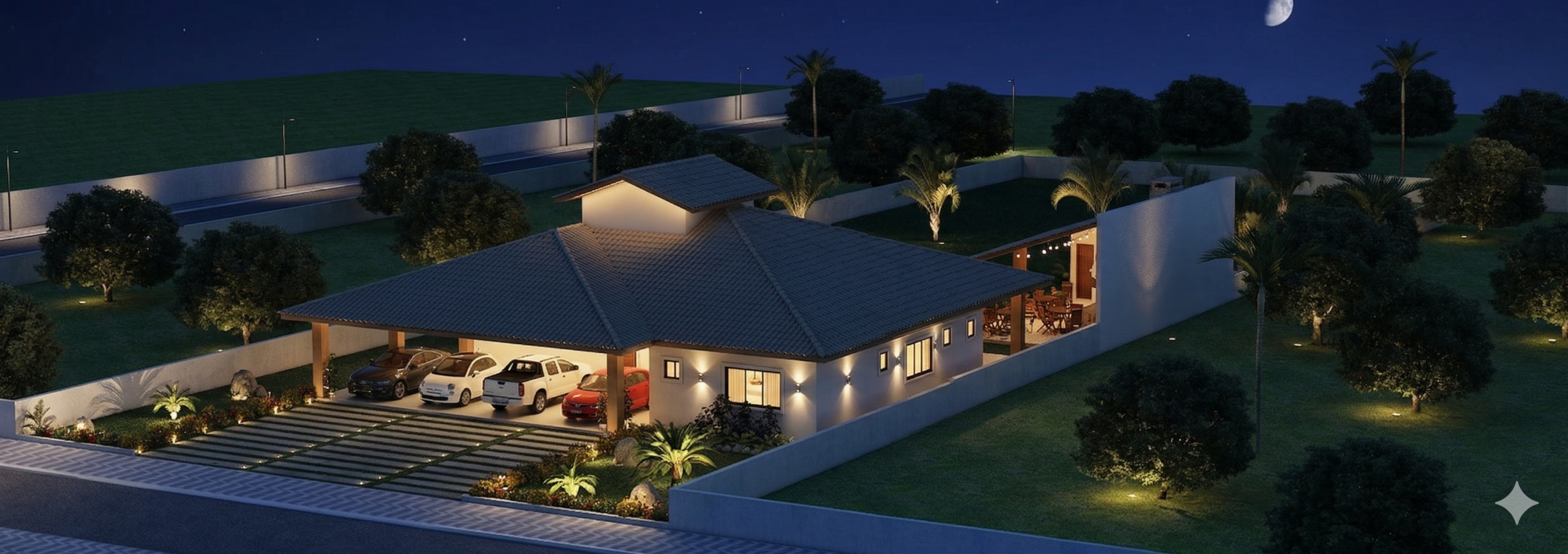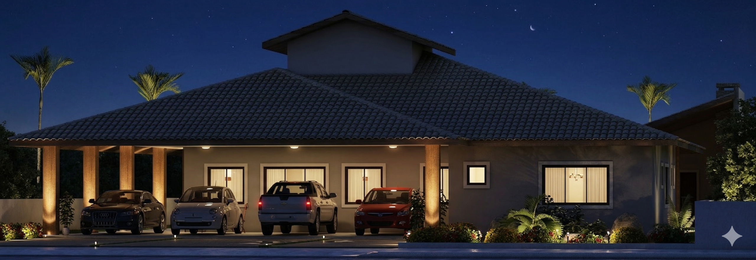 A fachada combina elementos tradicionais com toques contemporâneos, marcada pelo telhado imponente e pelas colunas em madeira que sustentam o alpendre. A garagem coberta comporta até quatro veículos, protegendo-os das intempéries e valorizando a fachada da residência. O paisagismo frontal complementa o visual, adicionando charme e equilíbrio à composição.