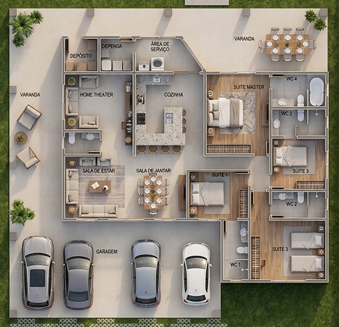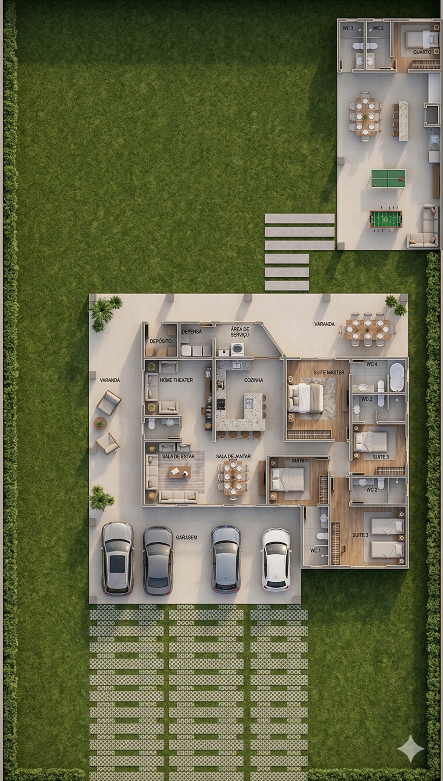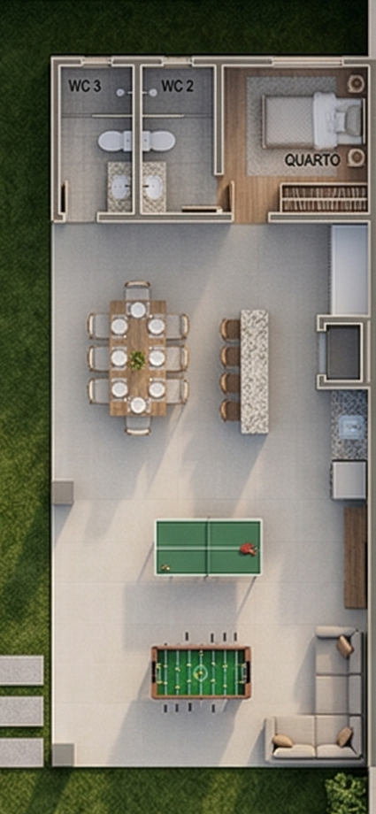 O projeto conta com quatro dormitórios, sendo uma suíte master ampla e três quartos confortáveis, ideais para hóspedes ou filhos. A sala de estar e jantar se conectam diretamente à cozinha e à varanda, proporcionando uma área de convivência perfeita para momentos em família. Cada ambiente foi planejado para garantir fluidez de circulação e conforto térmico, atendendo perfeitamente às necessidades de quem busca praticidade sem abrir mão de elegância.
