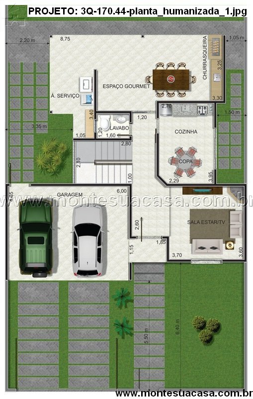 Projeto de sobrado moderno com 3 quartos e espaço gourmet integrado