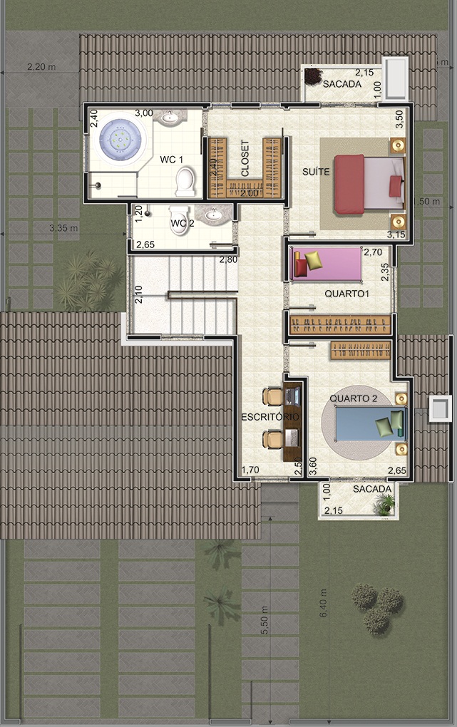 No piso superior, a suíte principal é ampla e aconchegante, contando com closet, dois banheiros (WC1 e WC2) e hidromassagem, garantindo conforto e privacidade. Os quartos adicionais (Quarto 1 e Quarto 2) possuem ótima iluminação e ventilação natural, sendo ideais para filhos ou hóspedes. Ambos contam com acesso à sacada, trazendo charme e ventilação cruzada ao ambiente.
