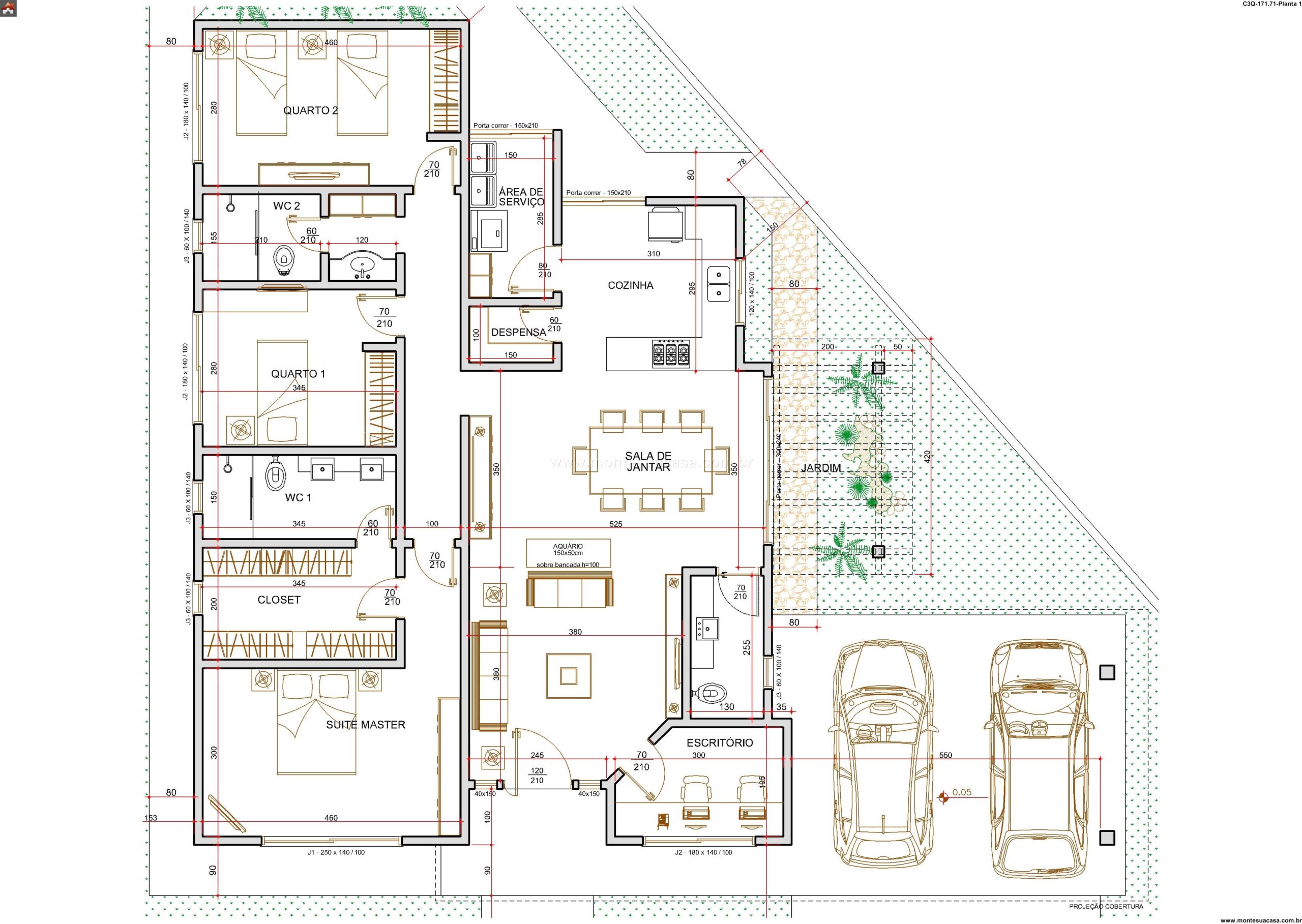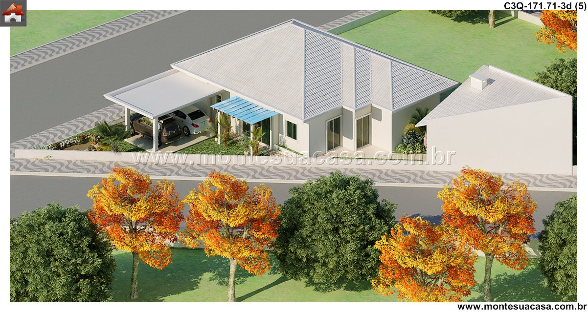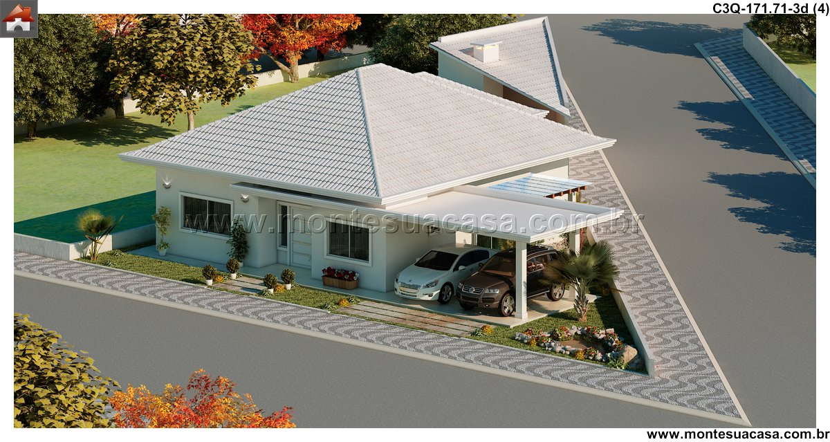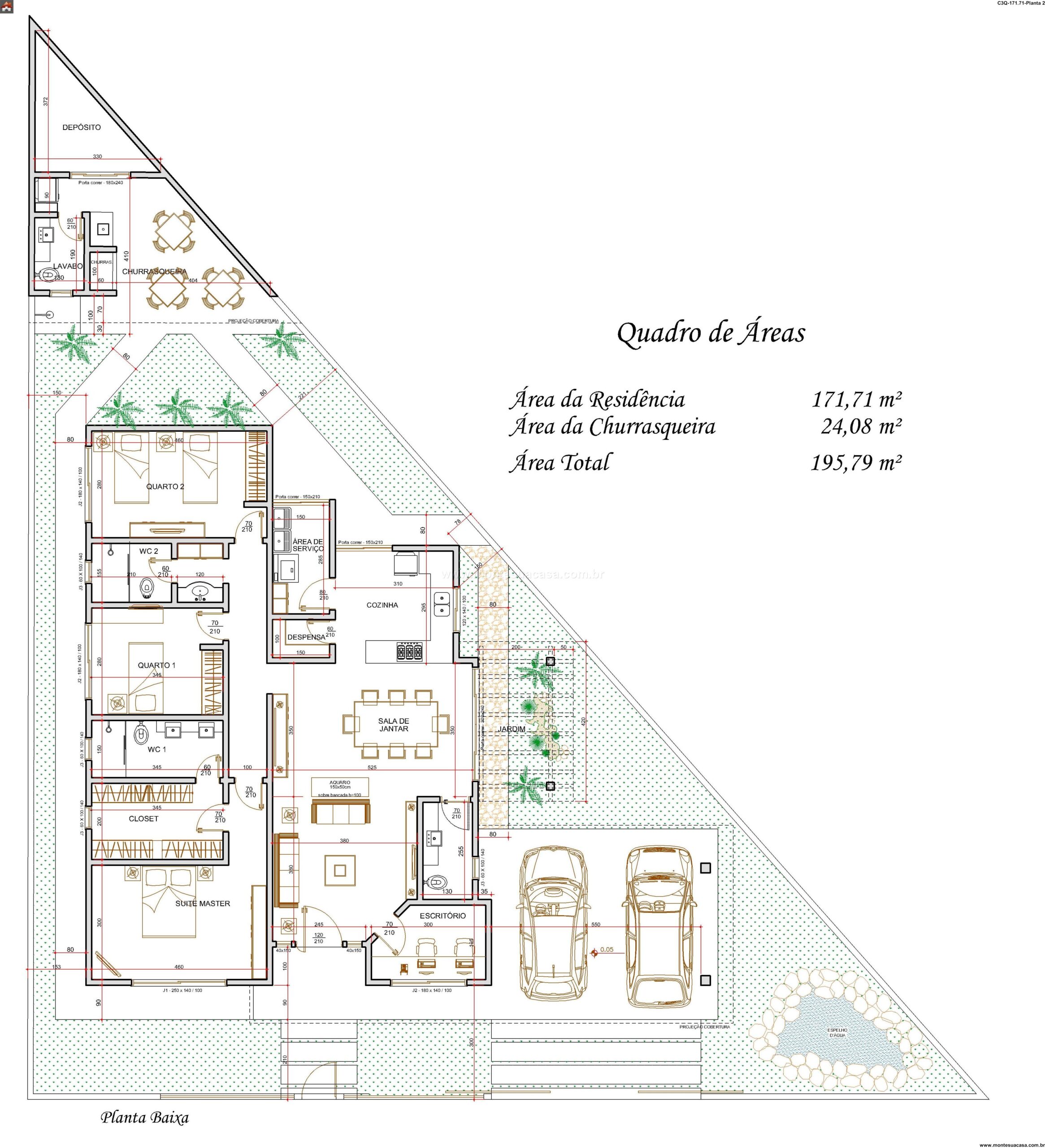 Este projeto de 171,71 m² foi desenhado para um lote triangular e inclinado, explorando cada metro disponível sem comprometer conforto. A implantação frontal acomoda garagem coberta para dois carros, garantindo praticidade imediata ao chegar. A circulação externa foi organizada para evitar desperdício de área, concentrando jardins laterais e fundos em faixas funcionais que valorizam a casa sem criar manutenção desnecessária.