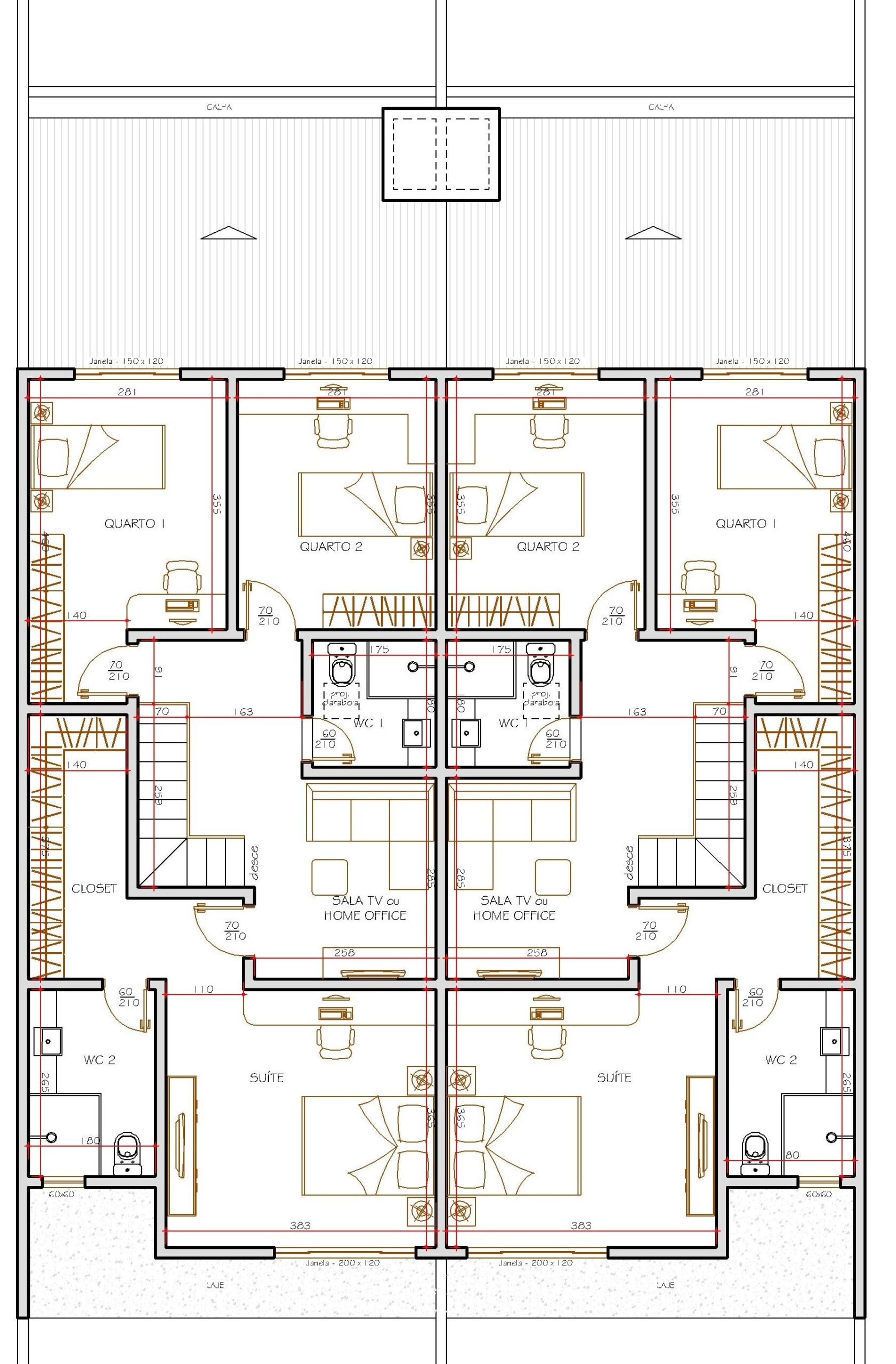 O pavimento superior concentra a área íntima do sobrado. A suíte principal pode acomodar cama queen ou king, espaço para home office e amplo closet. Os outros dois quartos atendem perfeitamente crianças, hóspedes ou até um segundo escritório. Há também uma sala íntima centralizada que pode funcionar como sala de TV, escritório ampliado ou espaço de estudos.