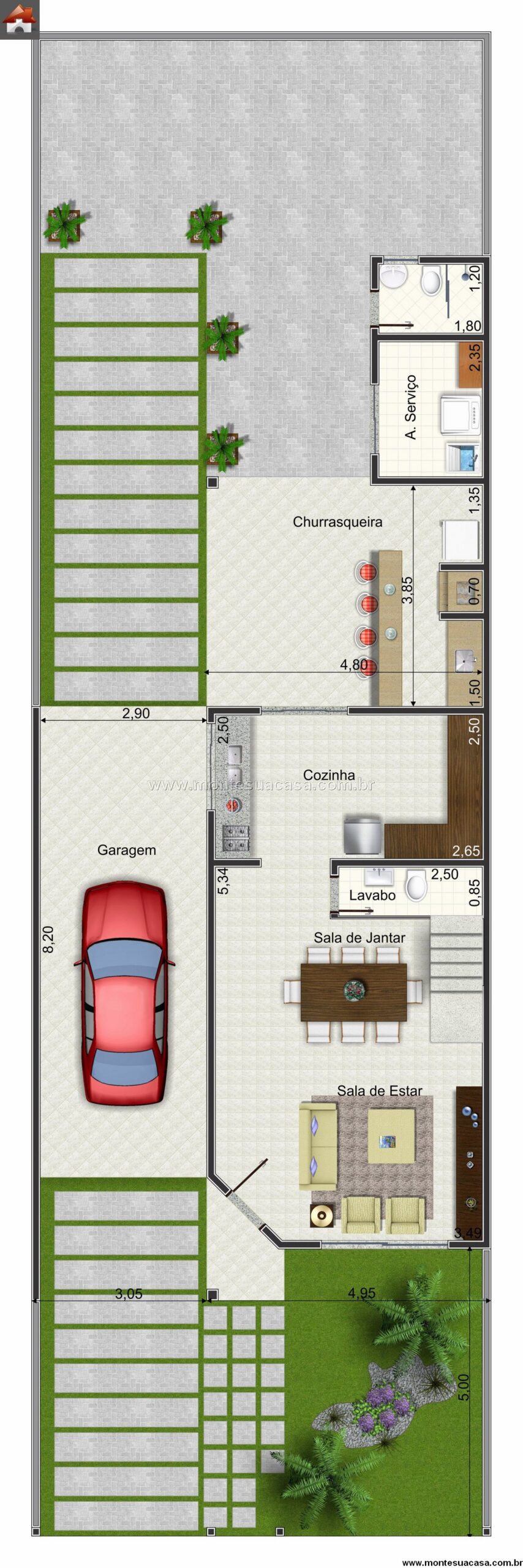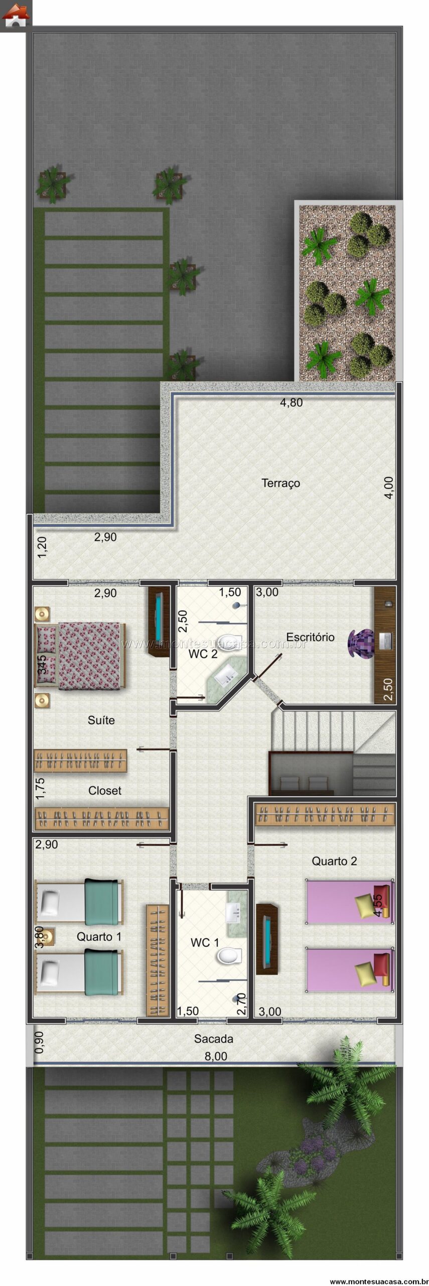 Com 10 m de largura mínima, o sobrado se adapta perfeitamente a terrenos urbanos, oferecendo uma excelente relação entre área construída e aproveitamento do lote. É um projeto ideal para famílias que buscam beleza, conforto e integração total entre interior e exterior.