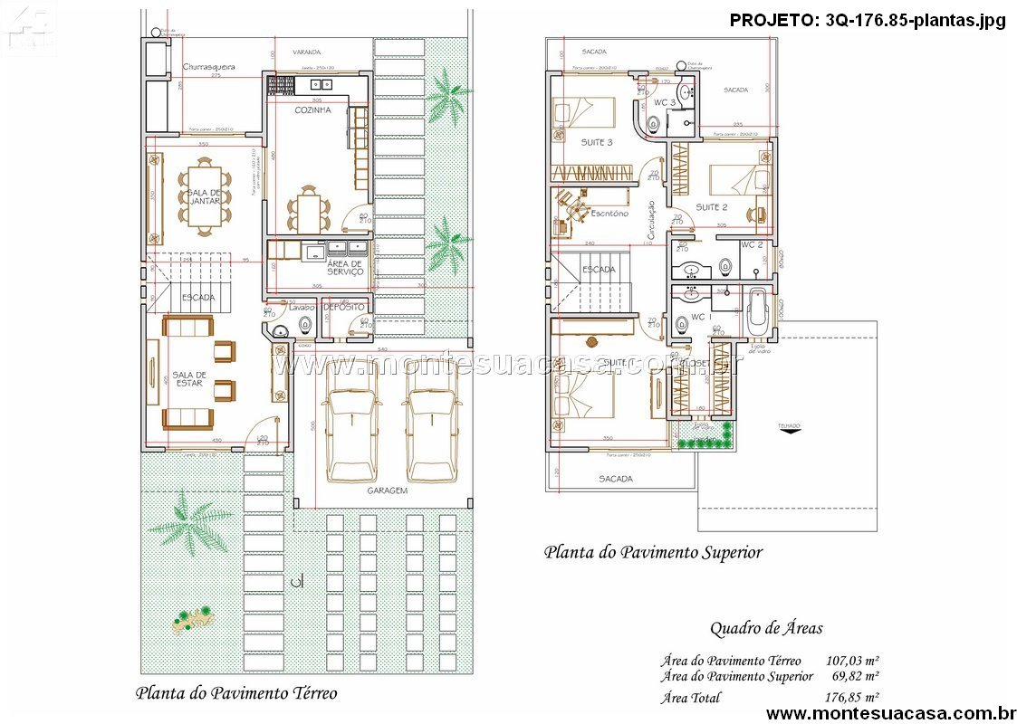 Com área construída total de 176,85 m², sendo 107,03 m² no pavimento térreo e 69,82 m² no pavimento superior, o projeto oferece o equilíbrio ideal entre amplitude e economia de espaço. É uma excelente opção para terrenos urbanos médios, com aproveitamento eficiente da área útil e circulação fluida entre os ambientes.