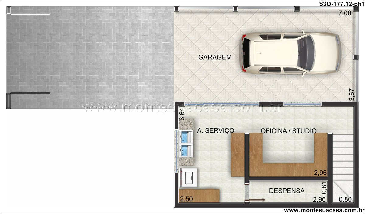 O pavimento inferior integra-se perfeitamente ao declive do terreno, abrigando as áreas de serviço e lazer. Aqui, você encontra uma garagem espaçosa, uma prática área de serviço, uma despensa organizada e um ambiente versátil que pode ser usado como oficina ou studio. Uma varanda aconchegante neste nível oferece um espaço de relaxamento ao ar livre, diretamente conectado com o exterior. Esta configuração aproveita o desnível natural para criar acessos independentes e otimizar a circulação dentro da residência, demonstrando um planejamento arquitetônico cuidadoso.