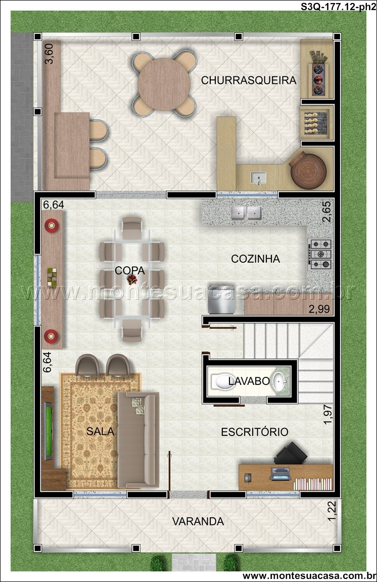 A área social no pavimento superior é um convite ao convívio, integrando sala, copa e cozinha em um ambiente amplo e fluido. A churrasqueira anexa transforma este espaço no coração da casa, ideal para receber amigos e familiares. A suite master oferece um refúgio privativo completo com closet e banheiro, enquanto dois quartos adicionais compartilham um banheiro bem localizado. Um lavabo próximo à sala e um escritório silencioso complementam a funcionalidade do projeto, atendendo a todas as necessidades de uma família moderna com praticidade e elegância.