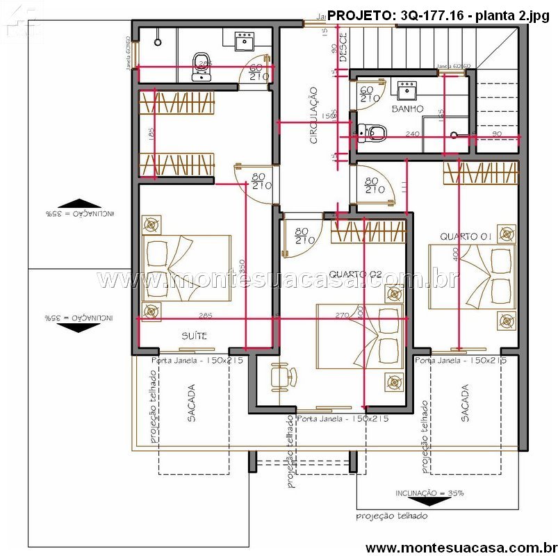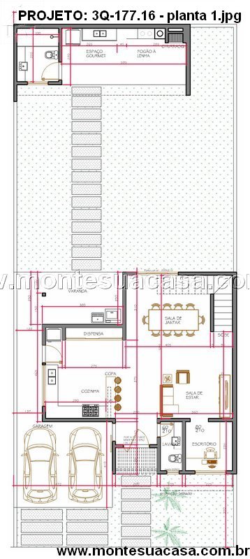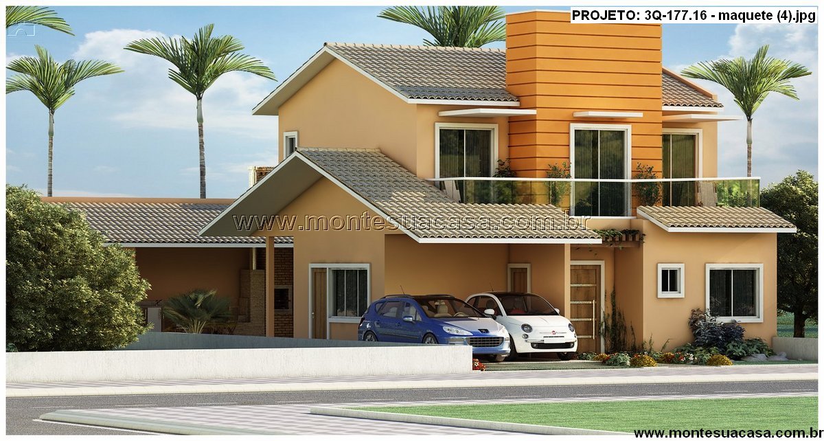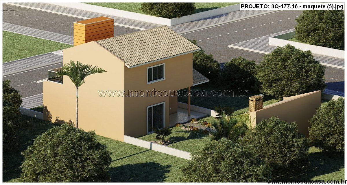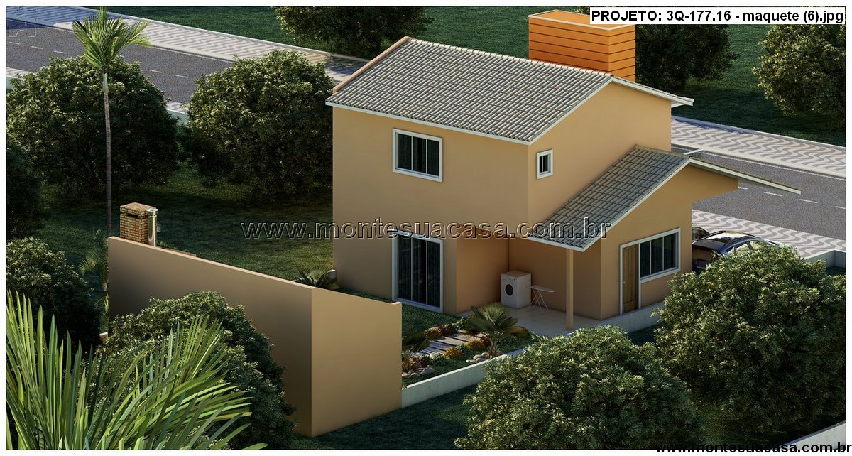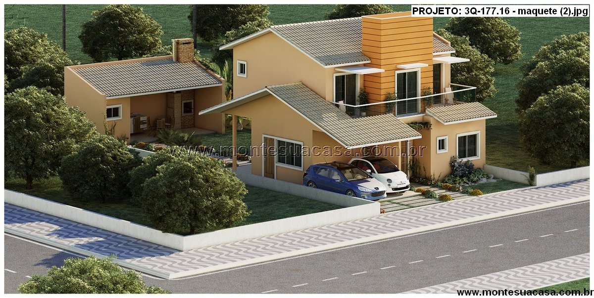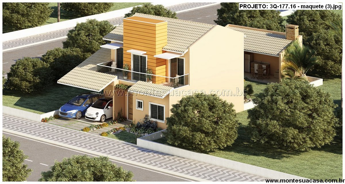 O projeto 3Q-177.16 apresenta um sobrado moderno com 177,16m² de área construída, ideal para famílias que valorizam conforto, funcionalidade e momentos de lazer. O design combina linhas contemporâneas com telhados tradicionais, resultando em uma fachada equilibrada e elegante. O destaque vai para o volume central revestido em tom amadeirado, que confere personalidade e sofisticação à frente da casa.