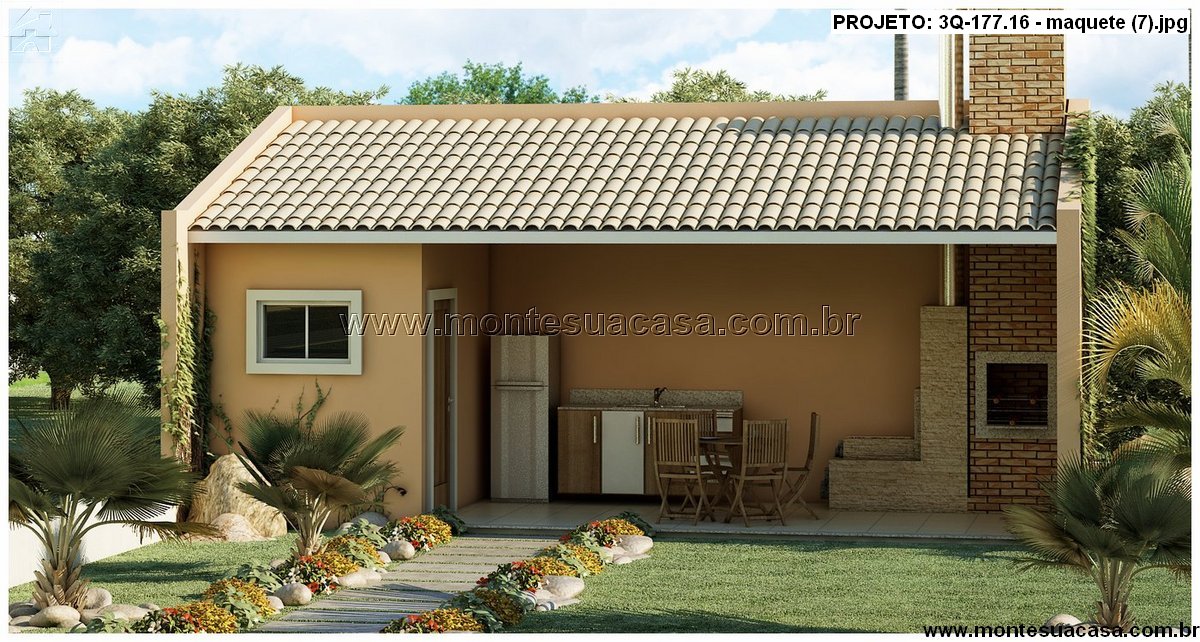 Nos fundos, o projeto apresenta um espaço gourmet completo com churrasqueira, bancada, pia e área para mesa de refeições, tornando-se o local perfeito para confraternizações em família ou com amigos. O acesso ao jardim é harmonioso, valorizando o contato com a natureza e o visual do quintal.