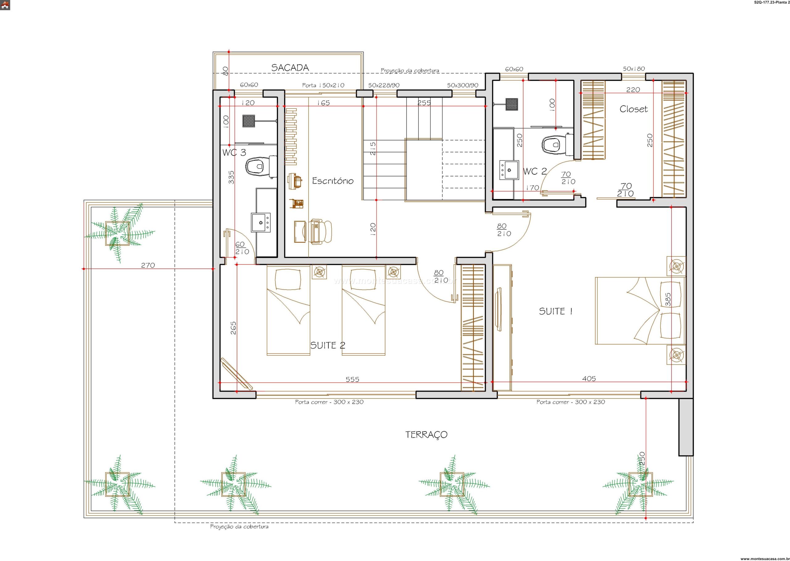 No pavimento superior, três suítes garantem conforto total. A Suíte 1 possui closet amplo e saída direta para o terraço frontal, criando um ambiente elegante e privativo. A Suíte 2 também tem acesso ao terraço, com excelente iluminação natural. A Suíte 3 recebe sacada exclusiva, garantindo privacidade e valorizando a fachada lateral. Um escritório completo complementa a planta superior, ideal para rotinas profissionais e estudos. O terraço frontal destaca-se como área de contemplação e descanso, ampliando o uso social também no pavimento superior.