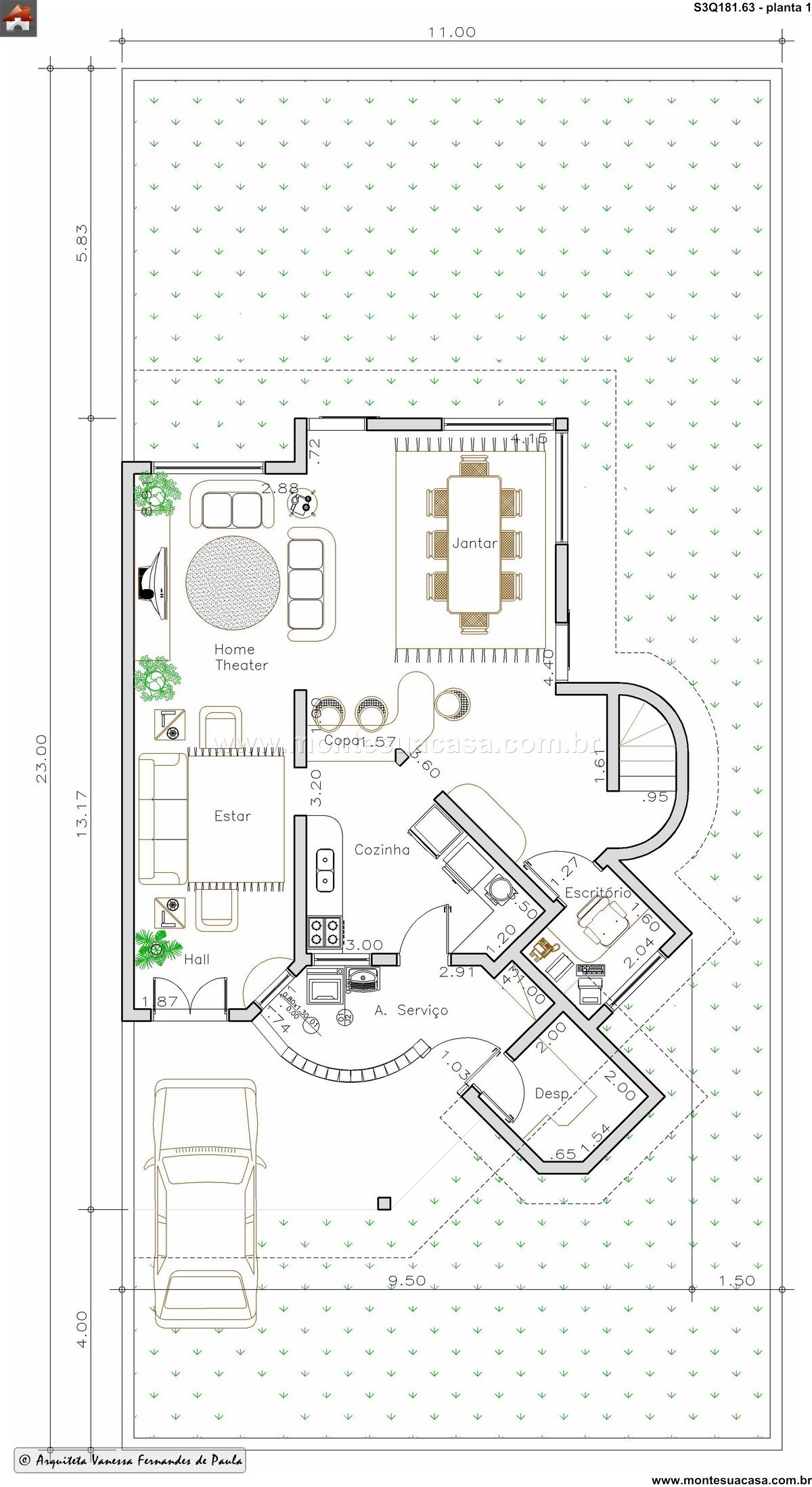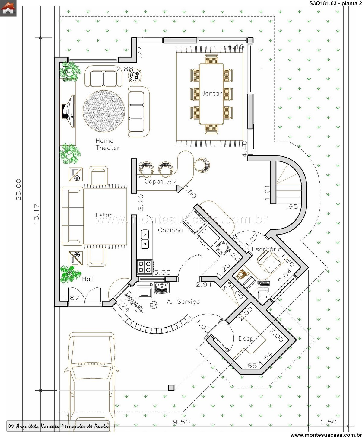 Ambientes sociais integrados e acolhedores O pavimento térreo apresenta uma planta bem distribuída, com hall de entrada que conecta o estar ao home theater, criando um ambiente perfeito para momentos de lazer. A sala de jantar se integra à copa e à cozinha, promovendo praticidade no dia a dia. A área de serviço é funcional e discreta, enquanto o escritório oferece privacidade para trabalho remoto ou estudos. Há ainda uma despensa estratégica e um banheiro social bem posicionado.