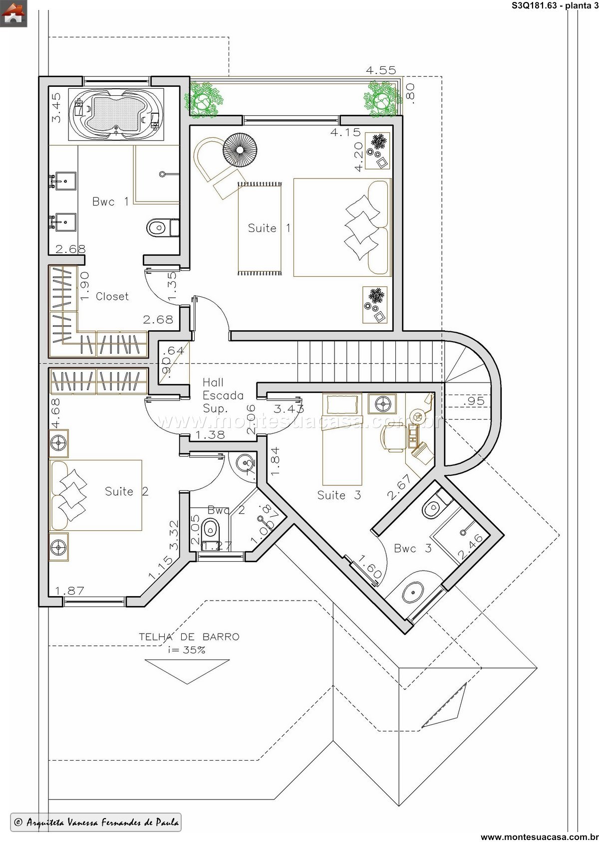 Design inteligente e estética refinada O telhado inclinado com 35% de inclinação e telhas de barro reforça o estilo tradicional com toque moderno. As esquadrias em madeira e os detalhes decorativos, como jardineiras e varandas, ampliam a conexão com o exterior. O projeto valoriza a iluminação natural e a ventilação cruzada, promovendo conforto térmico e eficiência energética.