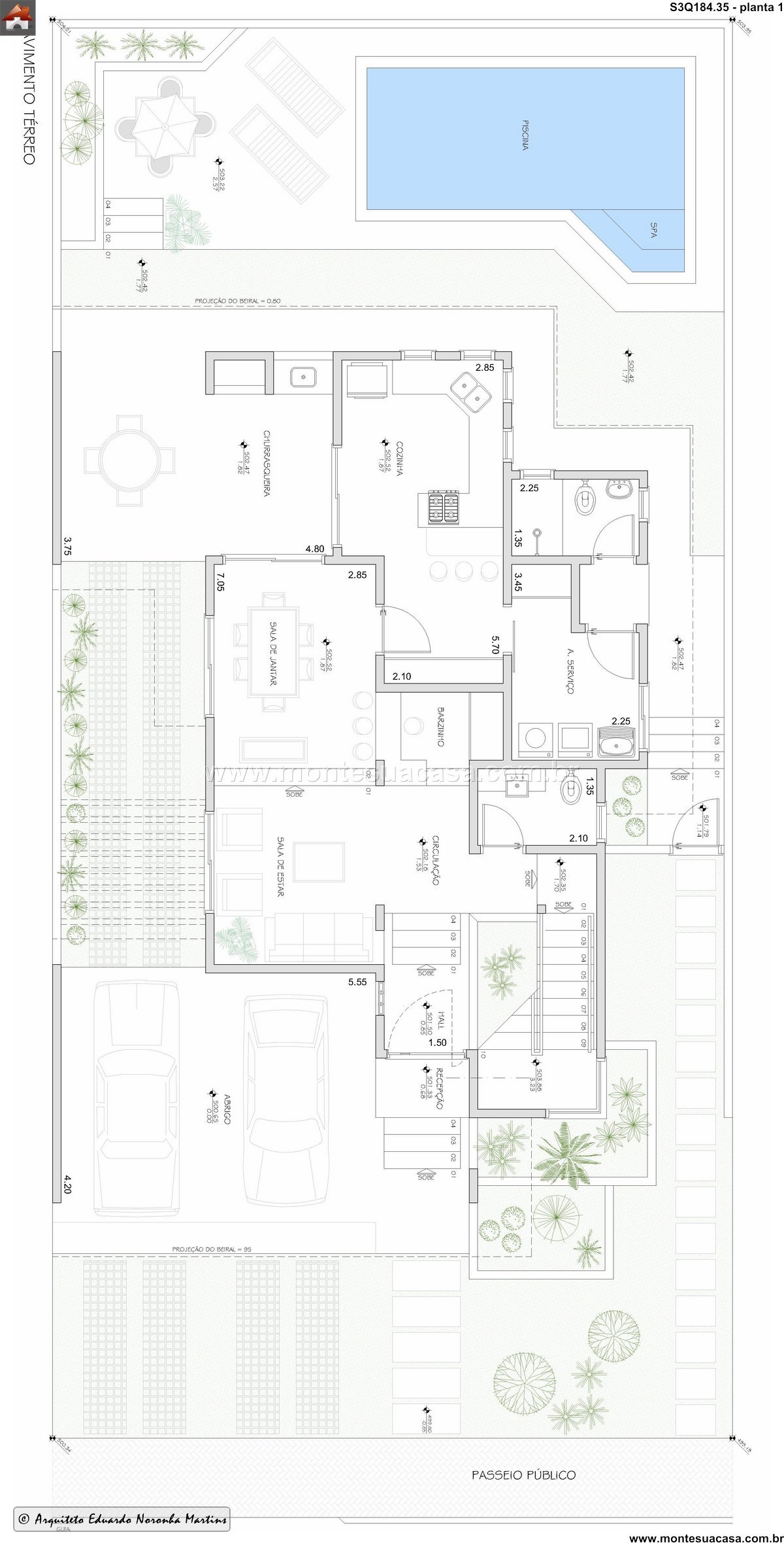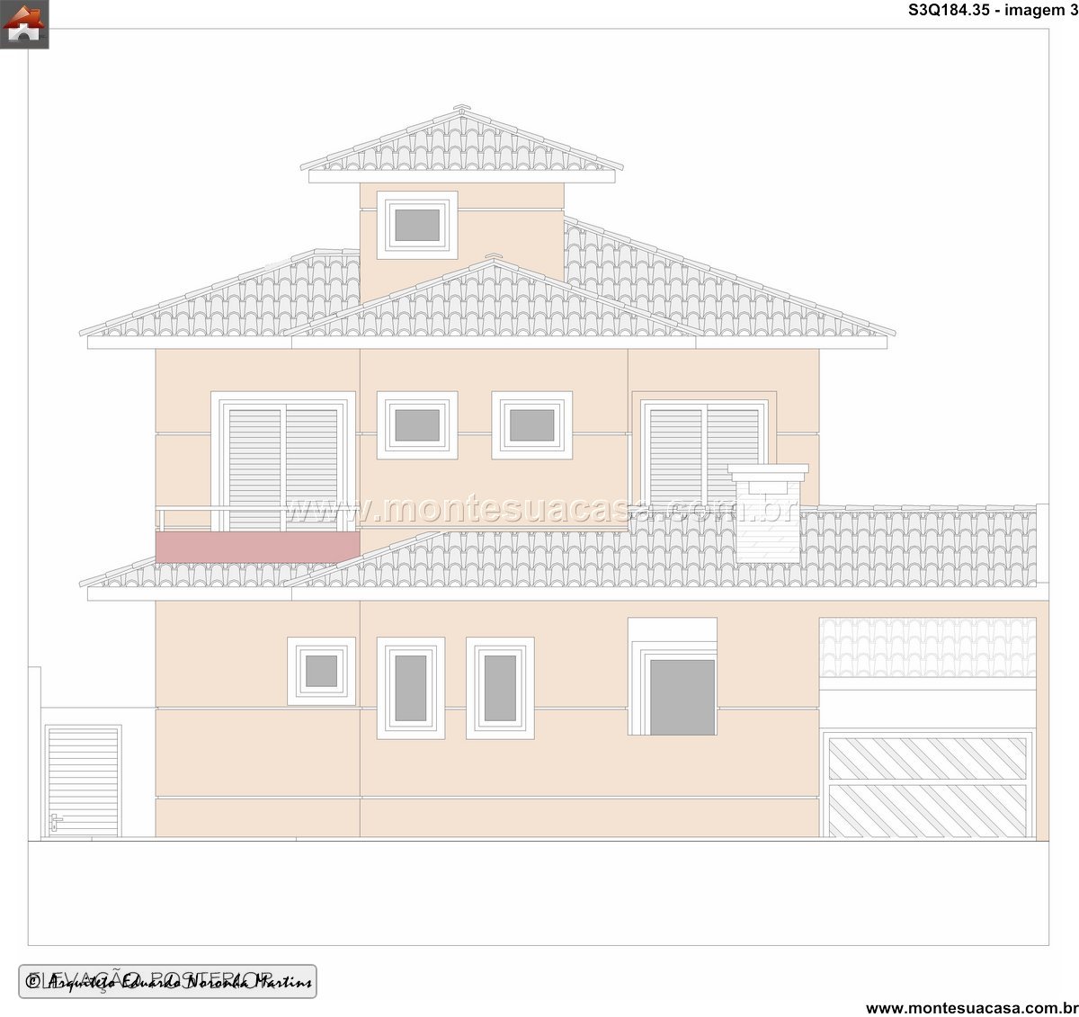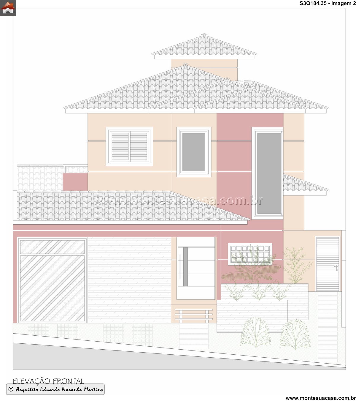Projeto moderno com integração entre lazer e conforto Este projeto de 184,35m² apresenta um sobrado contemporâneo de três quartos, ideal para famílias que valorizam espaços bem distribuídos e áreas de convivência. A fachada frontal revela uma composição elegante com volumes marcantes, janelas amplas e varandas que equilibram estética e funcionalidade. O telhado cerâmico em múltiplas águas reforça o estilo tradicional com toques modernos.