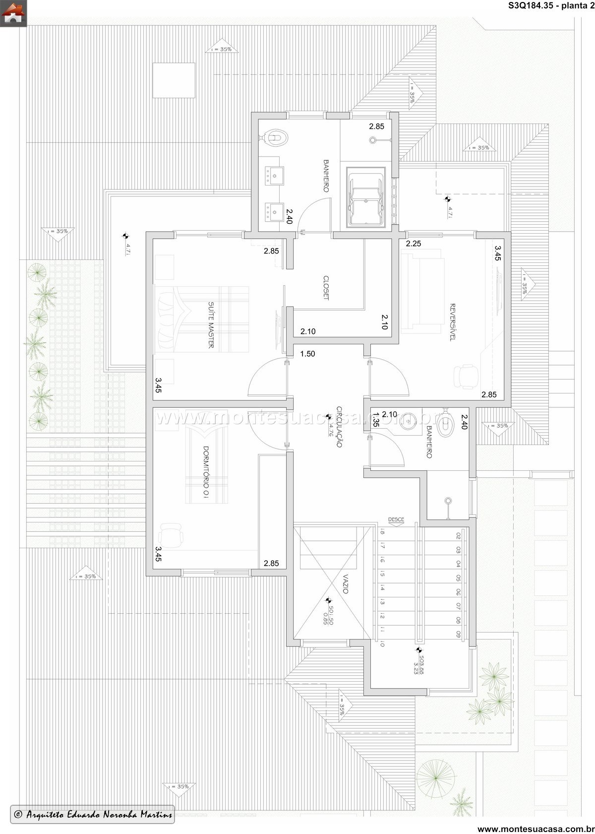 Pavimento superior com suíte master e versatilidade O segundo andar abriga a suíte master com closet e banheiro privativo, oferecendo privacidade e conforto. Dois dormitórios adicionais atendem às necessidades da família, enquanto o quarto reversível pode ser adaptado como escritório ou sala íntima. A circulação é otimizada e o vazio central proporciona iluminação natural abundante. A presença de dois banheiros no andar superior garante praticidade para os moradores.
