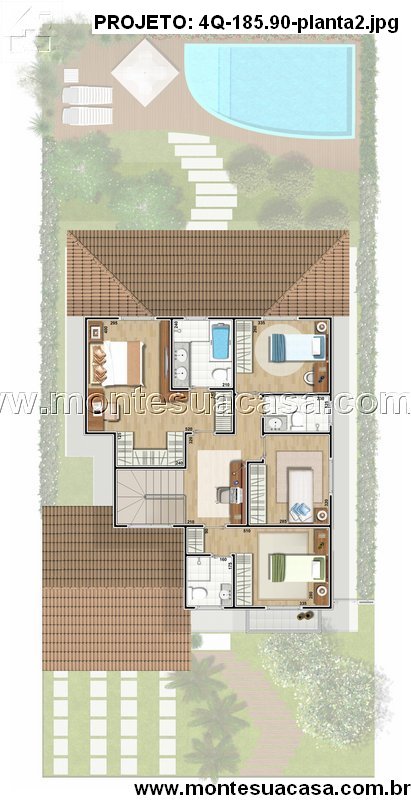 O piso superior abriga quatro dormitórios, sendo duas suítes, uma delas master com closet e varanda privativa. Os demais quartos possuem excelente iluminação natural e ventilação cruzada, favorecendo o conforto térmico. O hall de distribuição otimiza o acesso entre os cômodos e permite a instalação de um pequeno home office ou biblioteca.