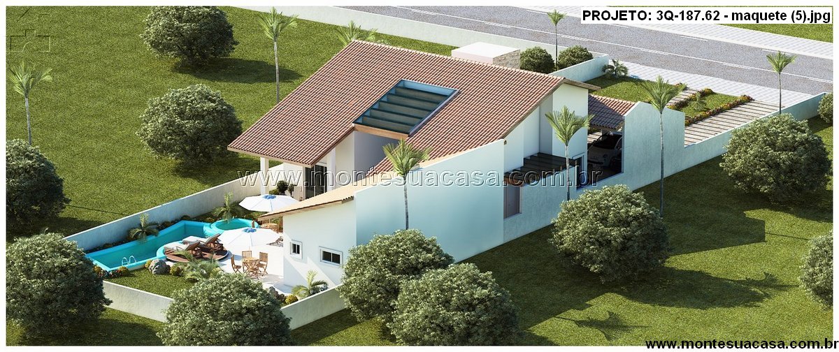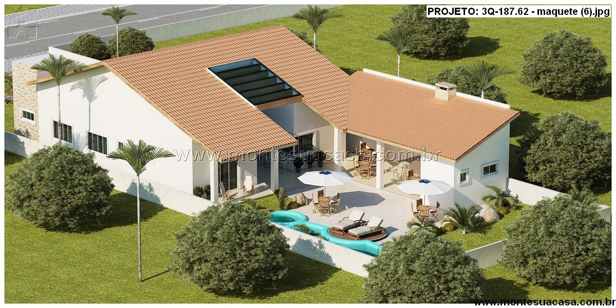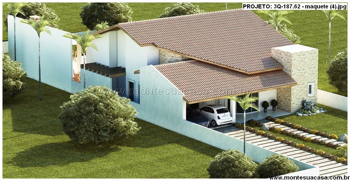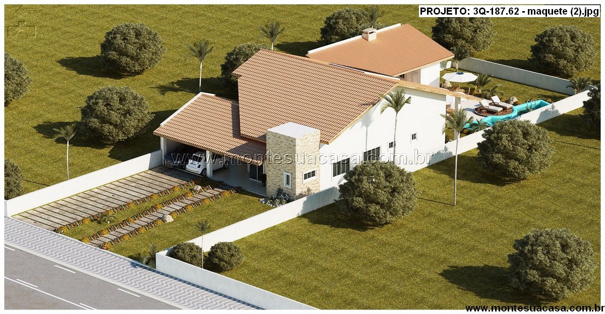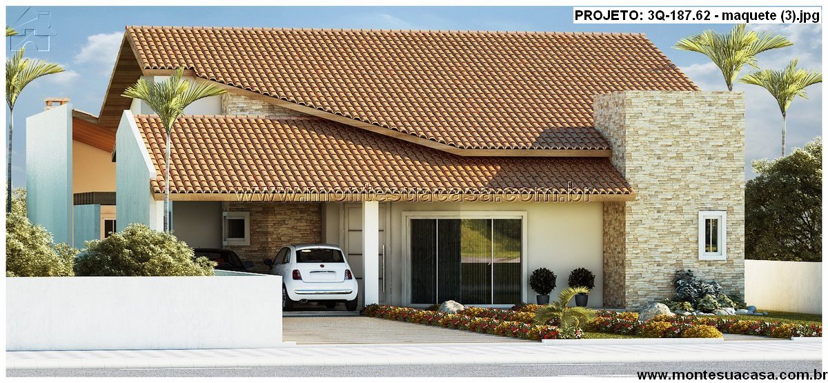 Este projeto de casa térrea com 187,62 m² une elegância, conforto e praticidade. Sua fachada imponente combina telhas cerâmicas tradicionais com detalhes em pedra natural, criando um visual moderno e acolhedor. A volumetria da cobertura em diferentes níveis destaca a área da sala e da garagem, enquanto o revestimento de pedra na chaminé e nas paredes externas reforça a sofisticação do conjunto.