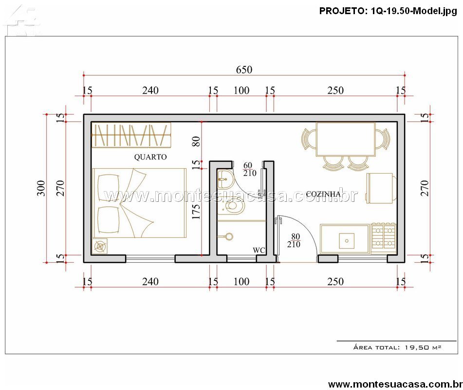 O projeto de casa com 1 quarto e 19,50m² foi desenvolvido para quem busca praticidade, economia e conforto em um espaço compacto e funcional. Essa planta é perfeita para terrenos pequenos, chácaras, condomínios de lazer ou até como kitnet de locação, oferecendo um ambiente bem distribuído e fácil de construir.