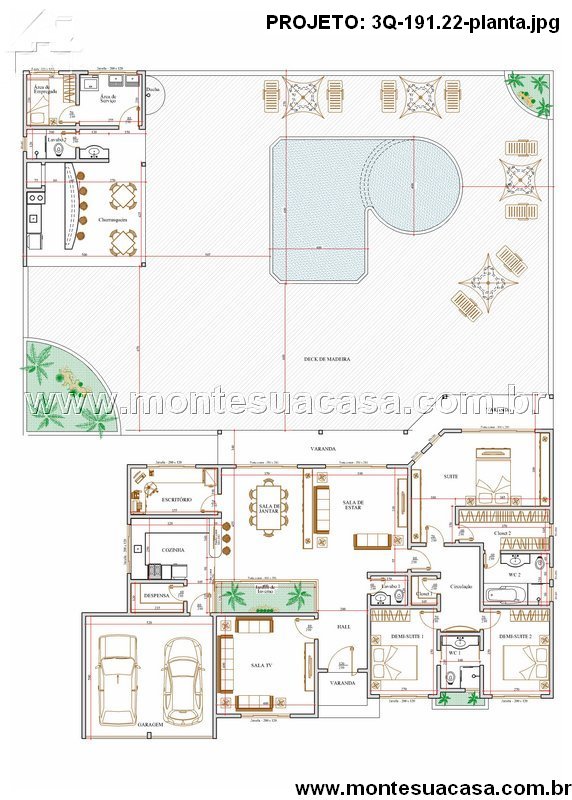 Este projeto de casa térrea com 191,22 m² apresenta uma proposta contemporânea, perfeita para famílias que valorizam o conforto, a praticidade e o lazer. O destaque principal está na ampla área gourmet com churrasqueira, integrada a um deck de madeira e piscina, criando um ambiente ideal para momentos de descanso e confraternização. O visual moderno e a cobertura com telhado aparente valorizam a fachada, que transmite elegância e harmonia.