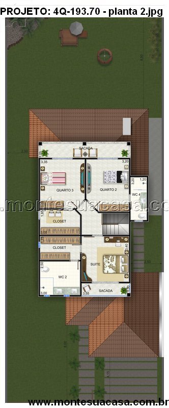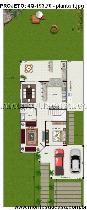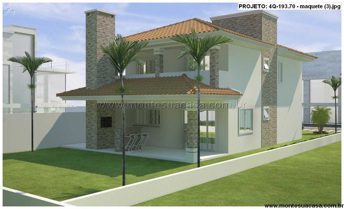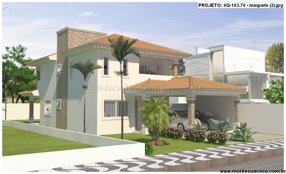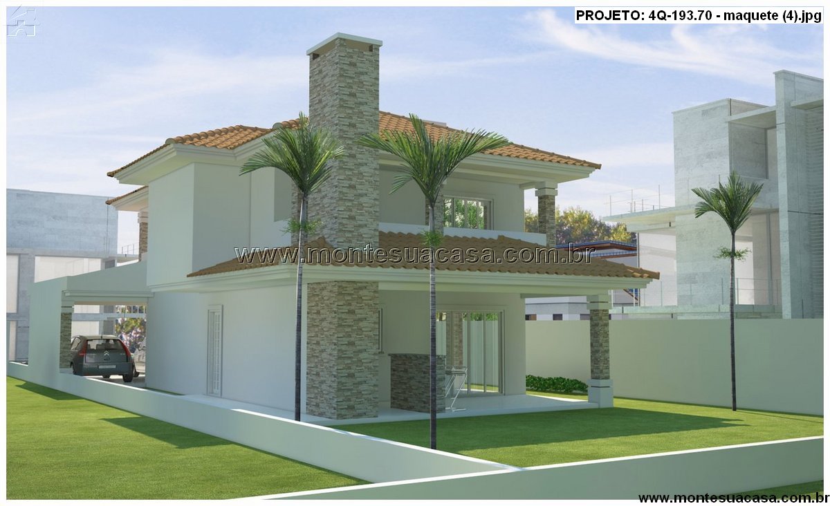 Projeto moderno com fachada imponente Este sobrado de 193,70m² combina elegância contemporânea com funcionalidade familiar. A fachada destaca-se pelo uso de pedras naturais, colunas robustas e telhado cerâmico, criando uma estética acolhedora e sofisticada. Grandes janelas e portas de vidro proporcionam excelente iluminação natural, enquanto o paisagismo com palmeiras e jardim frontal valoriza ainda mais o visual da residência.
