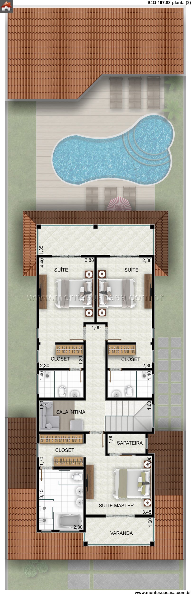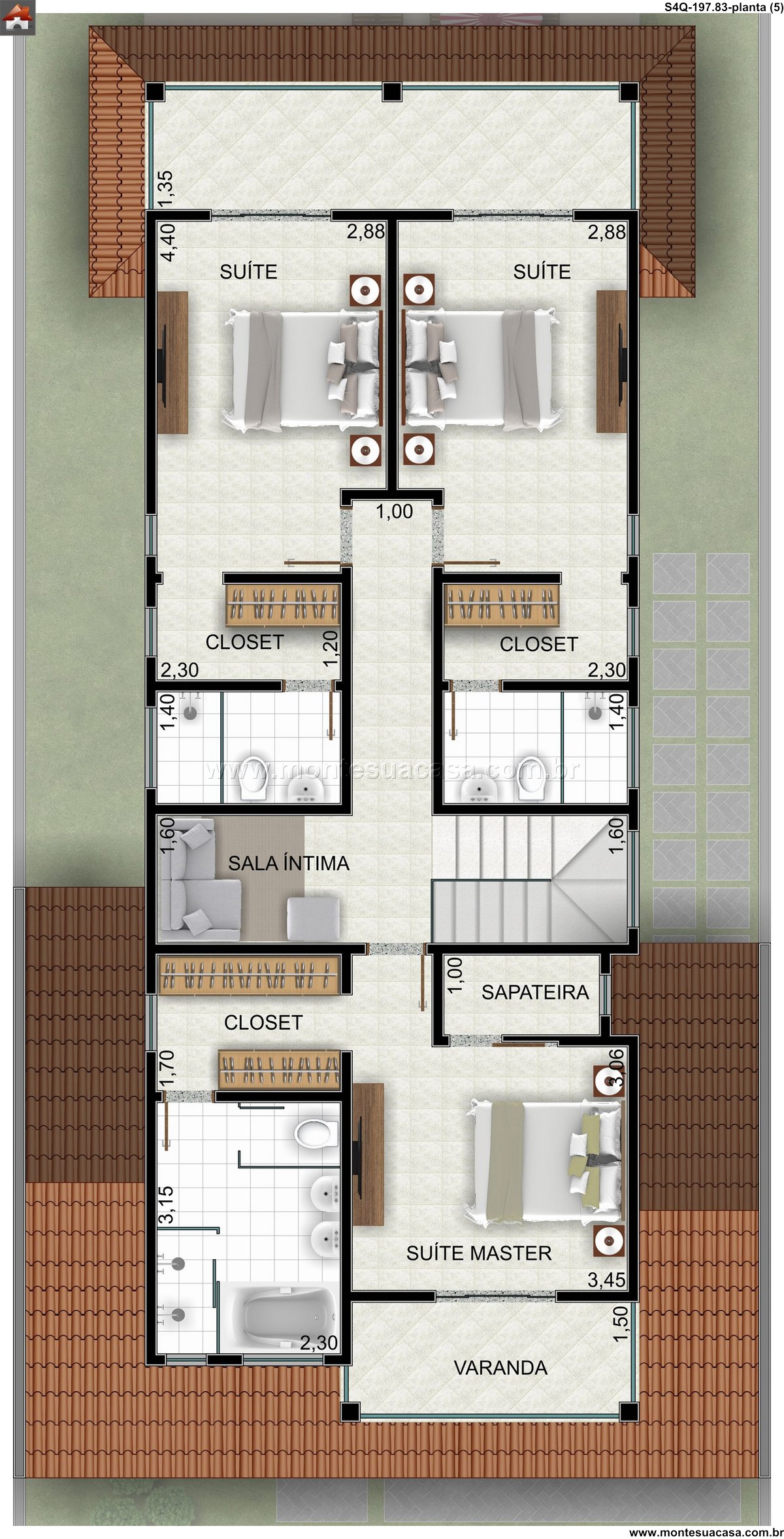 O pavimento superior é dedicado ao descanso e à intimidade, abrigando três quartos, incluindo a suíte master. Os ambientes foram distribuídos para maximizar o conforto, com os quartos secundários compartilhando uma sala íntima e um banheiro. A suíte master se destaca por suas generosas dimensões e closet organizado. Um closet adicional e uma sapataria atendem às necessidades de armazenamento, mantendo a organização em toda a casa.