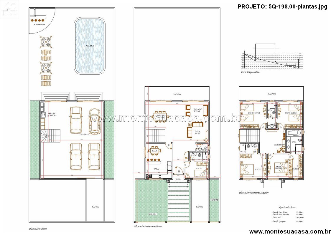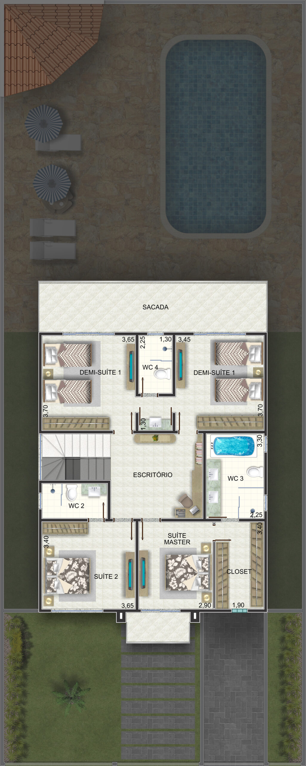 O pavimento superior é um refúgio de paz, abrigando a suíte master e mais duas suítes. A suíte master oferece um closet privativo, assegurando organização e praticidade. As demais suítes, uma delas demi-suite, compartilham um banheiro bem localizado. Todos os dormitórios superiores têm acesso a uma sacada, permitindo a entrada de luz natural e ventilação. Este andar garante total privacidade e descanso para os moradores.