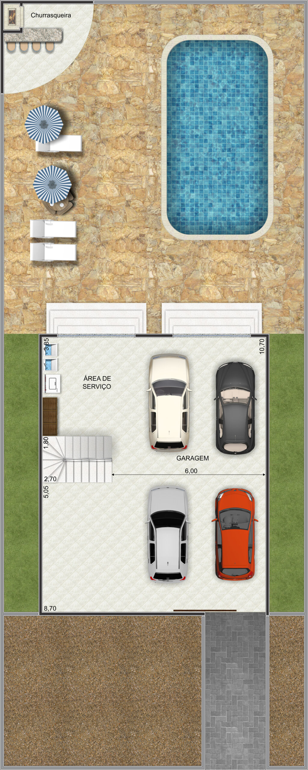 O subsolo é um ambiente versátil, abrigando a área de lazer e utilitária. A garagem espaçosa garante o conforto no dia a dia. Uma área de serviço bem dimensionada organiza as tarefas domésticas. O destaque fica por conta do espaço gourmet com churrasqueira, um convite a momentos descontraídos com família e amigos. Este nível se torna o coração das reuniões informais, complementando perfeitamente a área social do térreo.