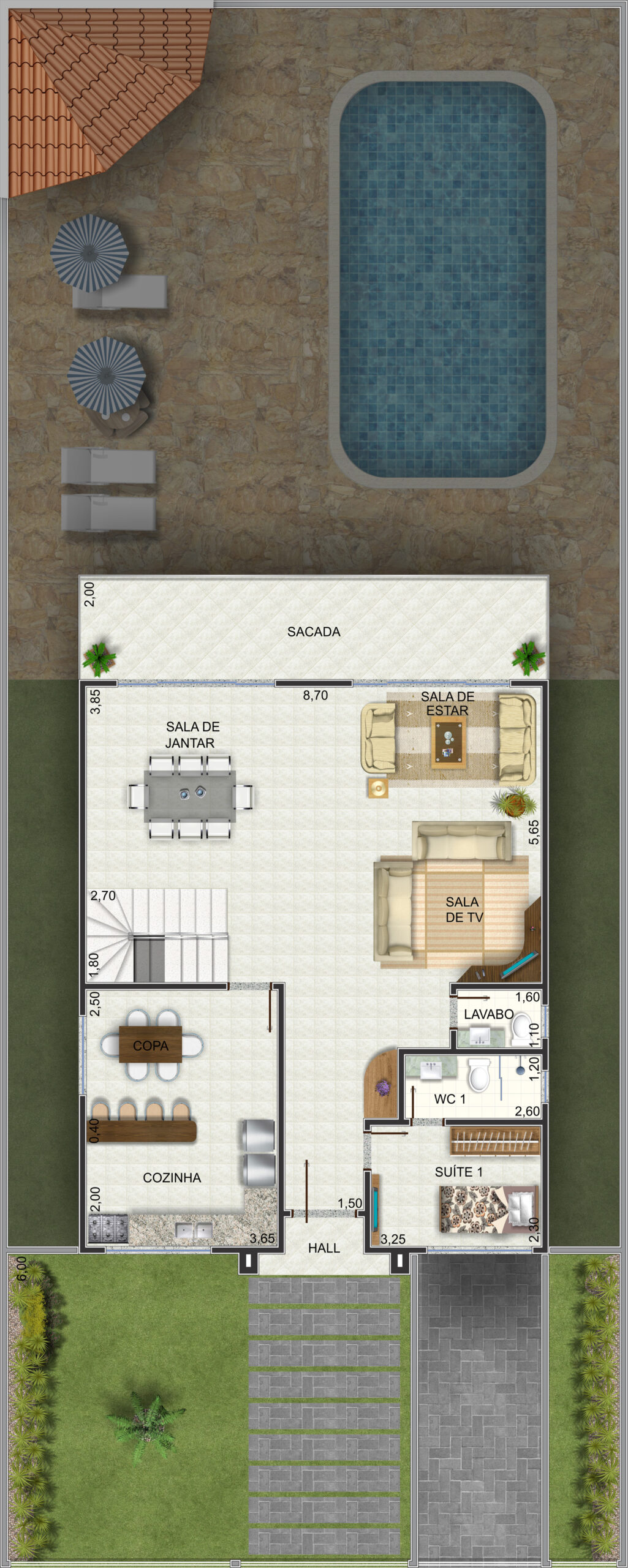 O térreo é dedicado integralmente à vida social e ao convívio. Você é recebido em um hall de entrada que direciona para a ampla sala de estar, integrada à sala de jantar. Esses ambientes fluem diretamente para uma generosa sacada, perfeita para entretenimento. A copa e a cozinha, estrategicamente posicionadas, facilitam o serviço e o dia a dia. Completam este nível um lavabo e a suíte 1, oferecendo comodidade para hóspedes ou moradores.