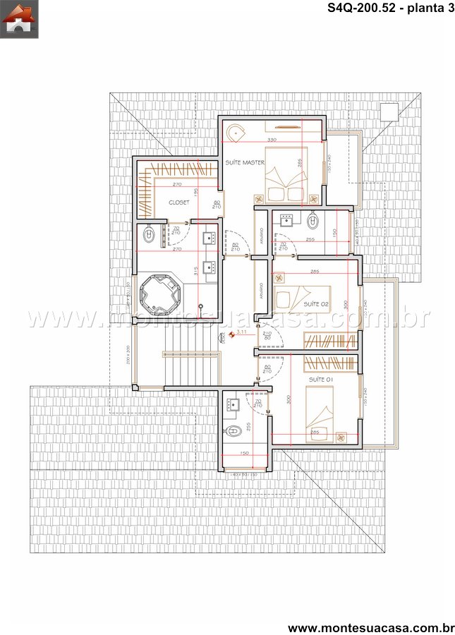 O projeto abriga quatro quartos, sendo uma suíte master com amplo closet e banheiro privativo. Os quartos são bem distribuídos pelo andar superior, assegurando privacidade e sossego para todos os moradores. Cada ambiente incorpora iluminação e ventilação naturais, contribuindo para o bem-estar. Os banheiros sociais e privativos seguem um padrão de acabamento de alta qualidade, com revestimentos que aliam durabilidade e sofisticação. O projeto de iluminação artificial complementa a atmosfera, criando ambientes aconchegantes à noite.