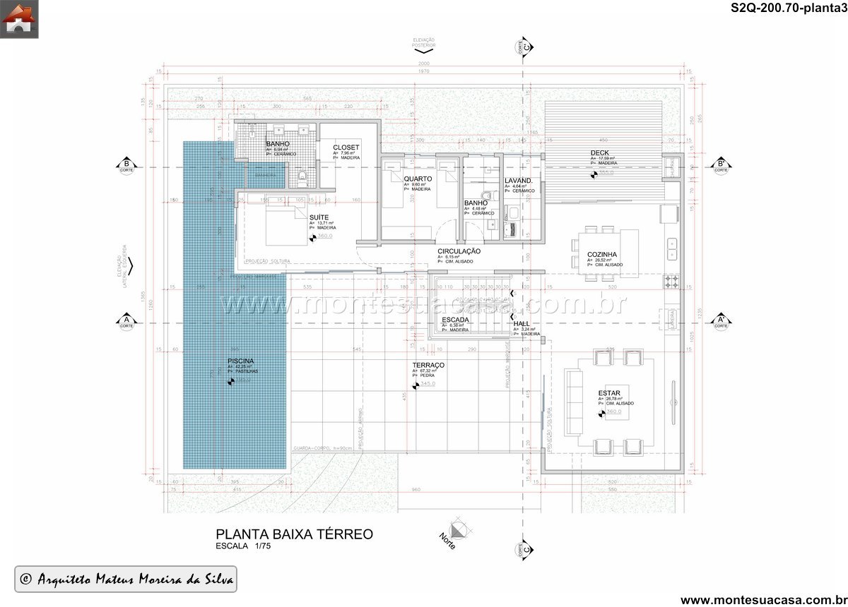 A casa possui três dormitórios, sendo uma suíte com closet e banheiro amplo. Os outros quartos se distribuem ao longo da circulação, junto a um banheiro completo. A lavanderia está estrategicamente localizada próxima aos quartos, evitando deslocamentos desnecessários. Todos os ambientes íntimos receberam atenção à ventilação cruzada e iluminação natural.