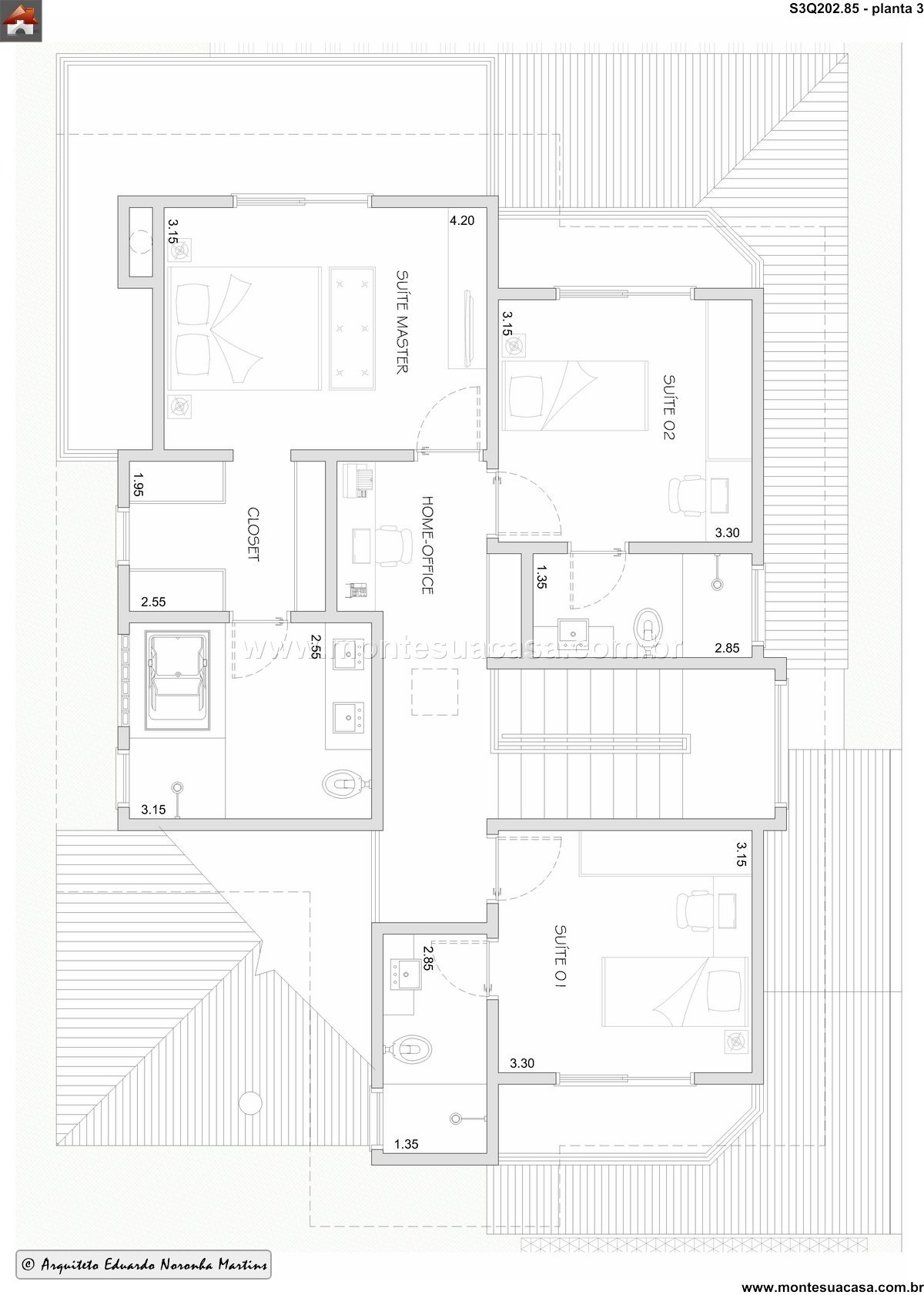 O pavimento superior é dedicado à área íntima, abrigando os três quartos com excelente insolação e ventilação. O projeto garante privacidade aos dormitórios sem isolá-los do conceito geral da casa. Os banheiros seguem um layout eficiente, priorizando o uso racional do espaço. A arquitetura privilegia a iluminação natural em todos os cômodos, criando ambientes saudáveis e aconchegantes. Este sobrado representa o equilíbrio perfeito entre a vida social e a privacidade familiar, em um projeto que valoriza cada detalhe.