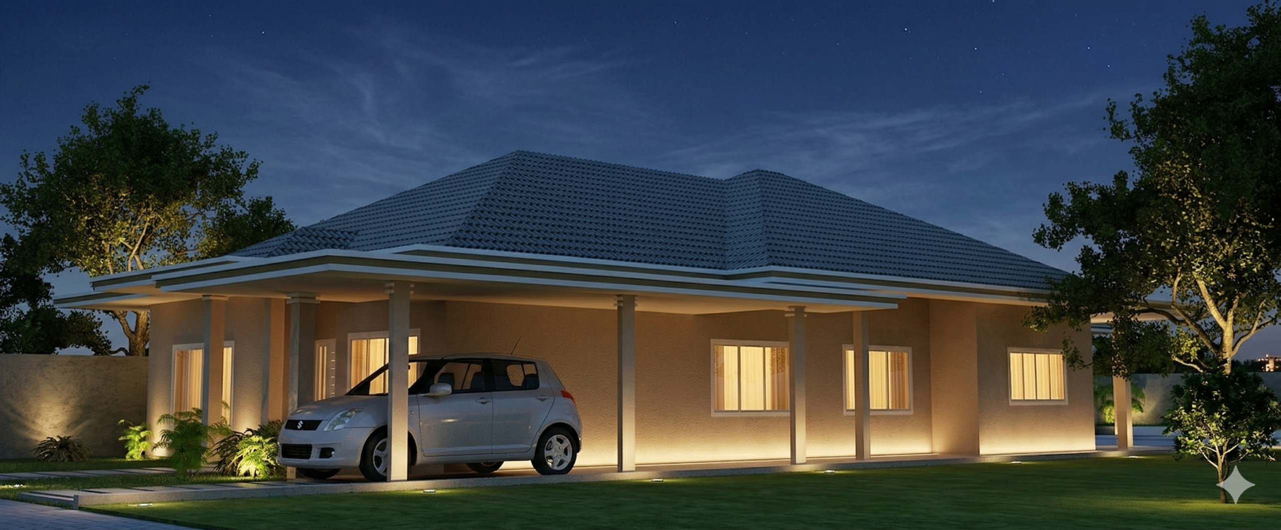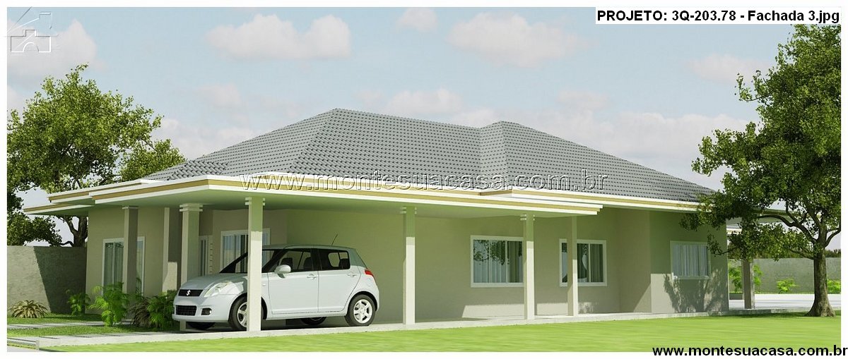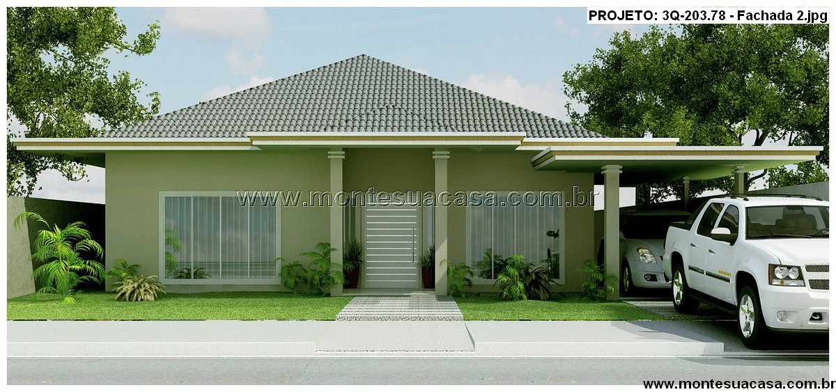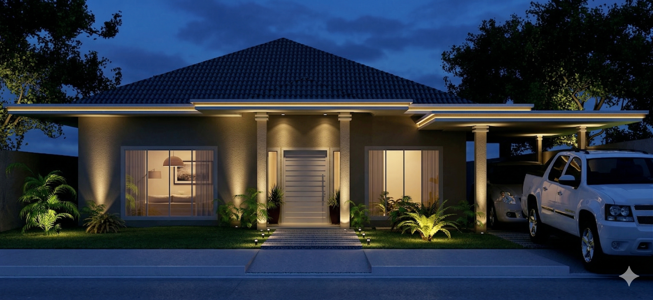 A fachada principal apresenta um design contemporâneo com telhado em quatro águas, colunas robustas e acabamento em tons neutros. A entrada é marcada por um pequeno pórtico com paisagismo integrado. A garagem coberta acomoda dois veículos com praticidade e estilo.