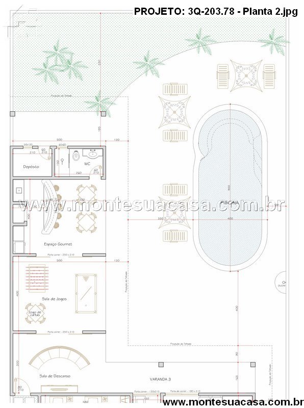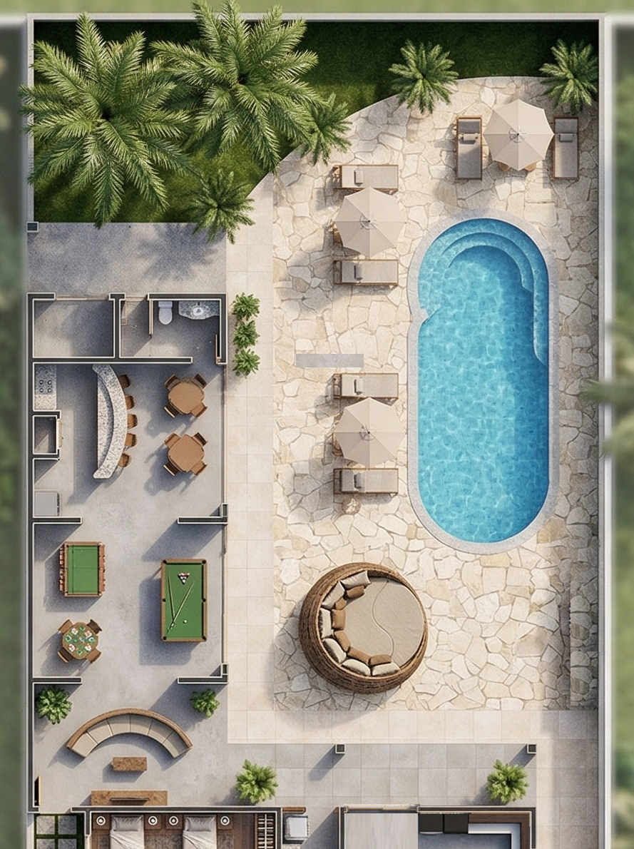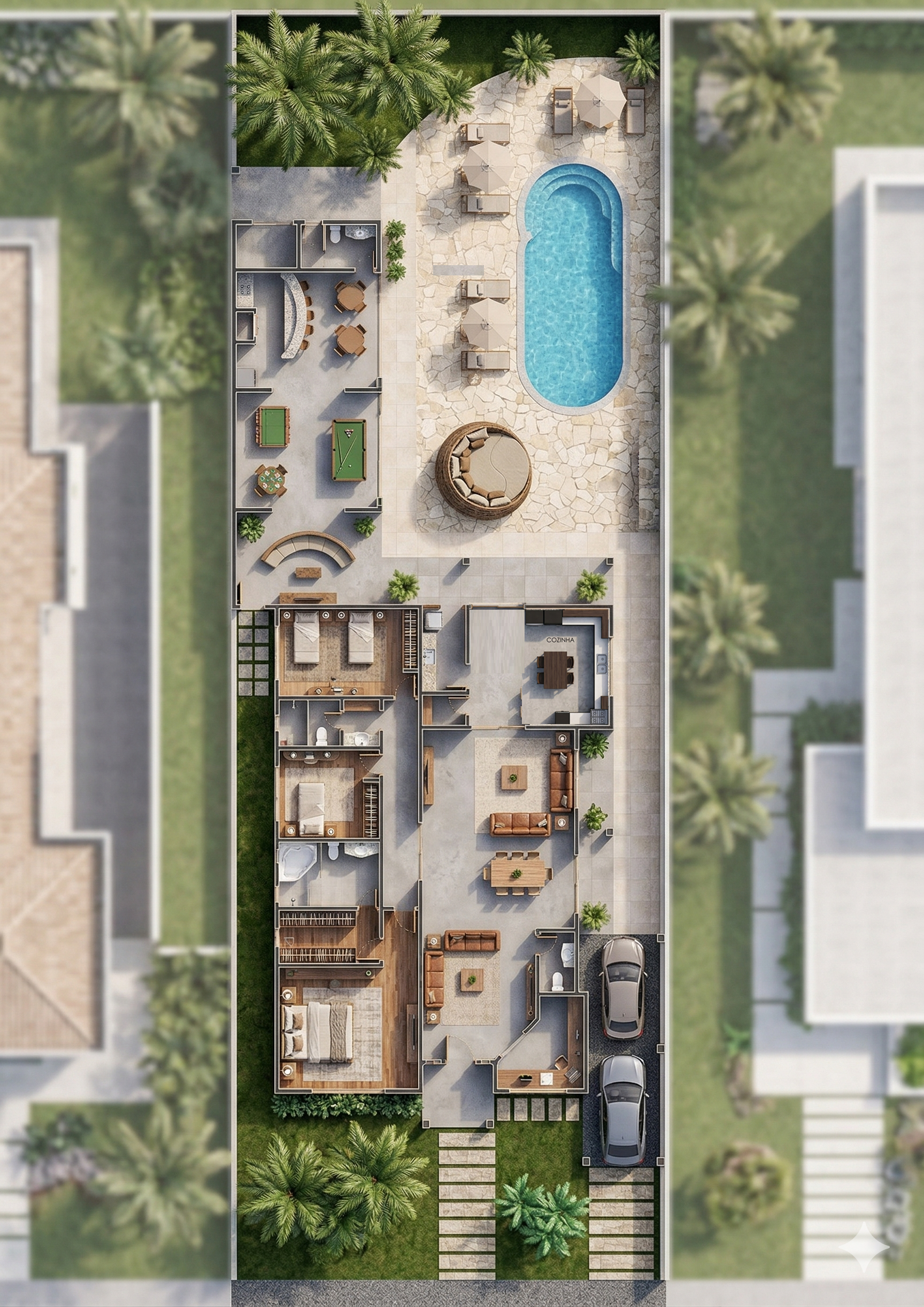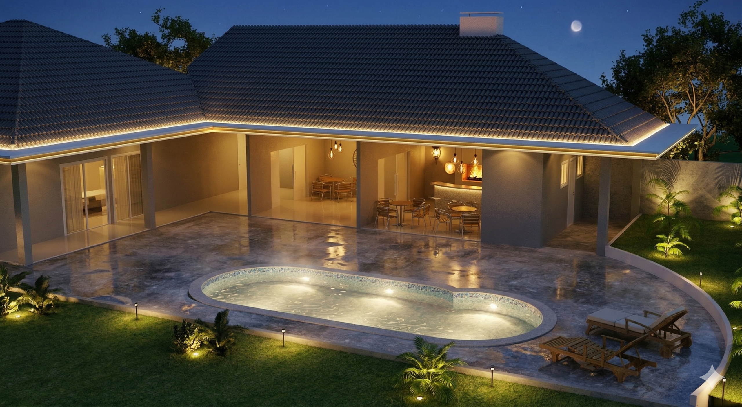 O destaque do projeto está na área de lazer separada da casa principal. Ela inclui piscina, varanda gourmet, sala de jogos e espaço de descanso. Essa estrutura proporciona momentos inesquecíveis com amigos e familiares, seja em confraternizações ou dias de relaxamento. A integração entre os ambientes internos e externos valoriza o conforto e a convivência.
