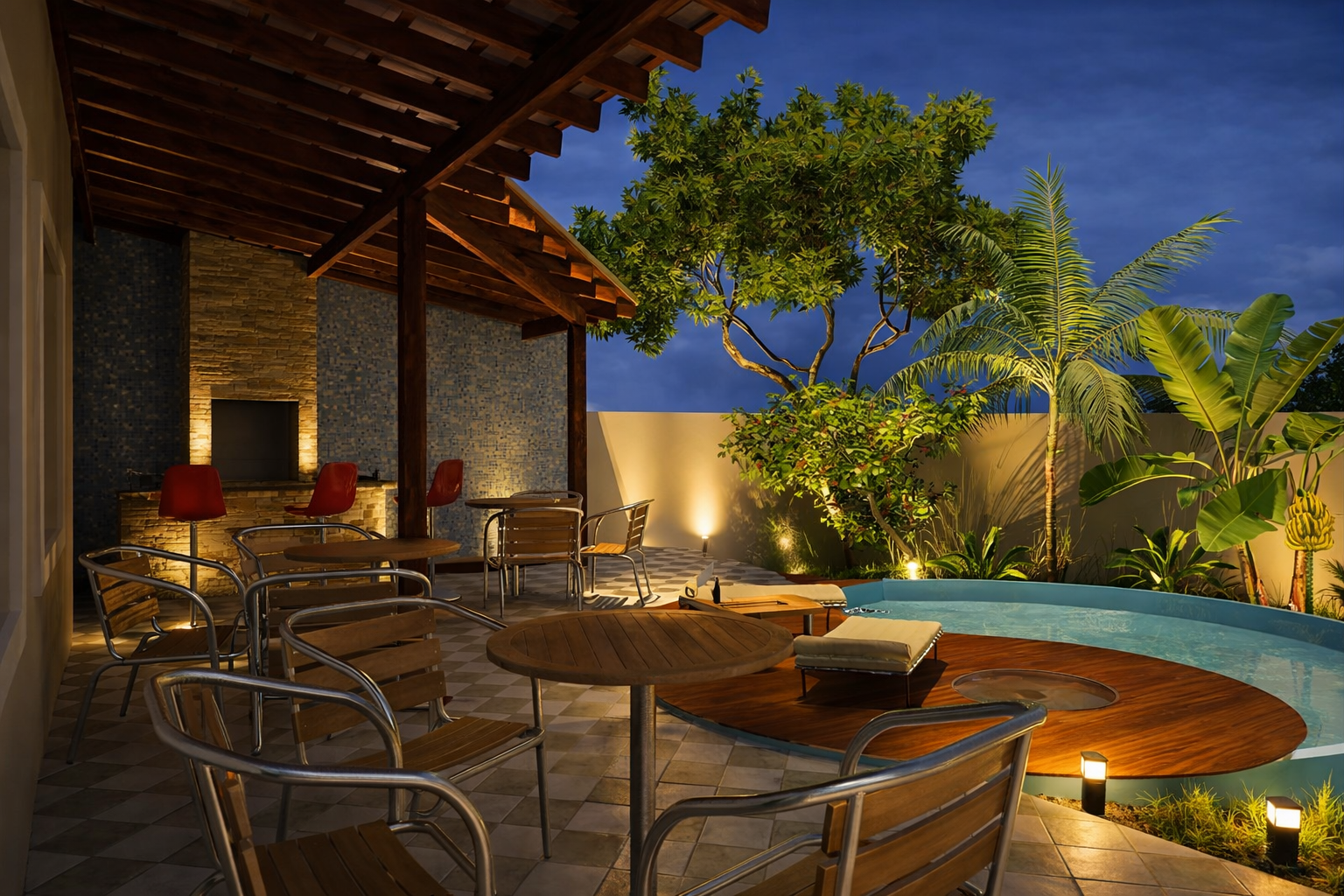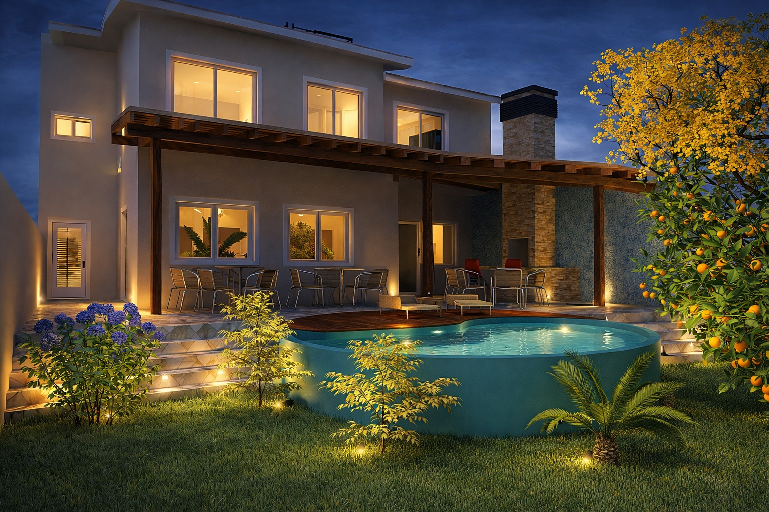 A área externa foi desenvolvida como uma extensão natural da vida interna, proporcionando um local ideal para o lazer. O projeto de paisagismo integra a vegetação à arquitetura, criando um ambiente sereno e convidativo. Esse espaço é perfeito para momentos de descontração ao ar livre, valorizando o contato com a natureza. A permeabilidade visual mantém a conexão com os jardins, reforçando a proposta de uma moradia que celebra a luz e a liberdade.