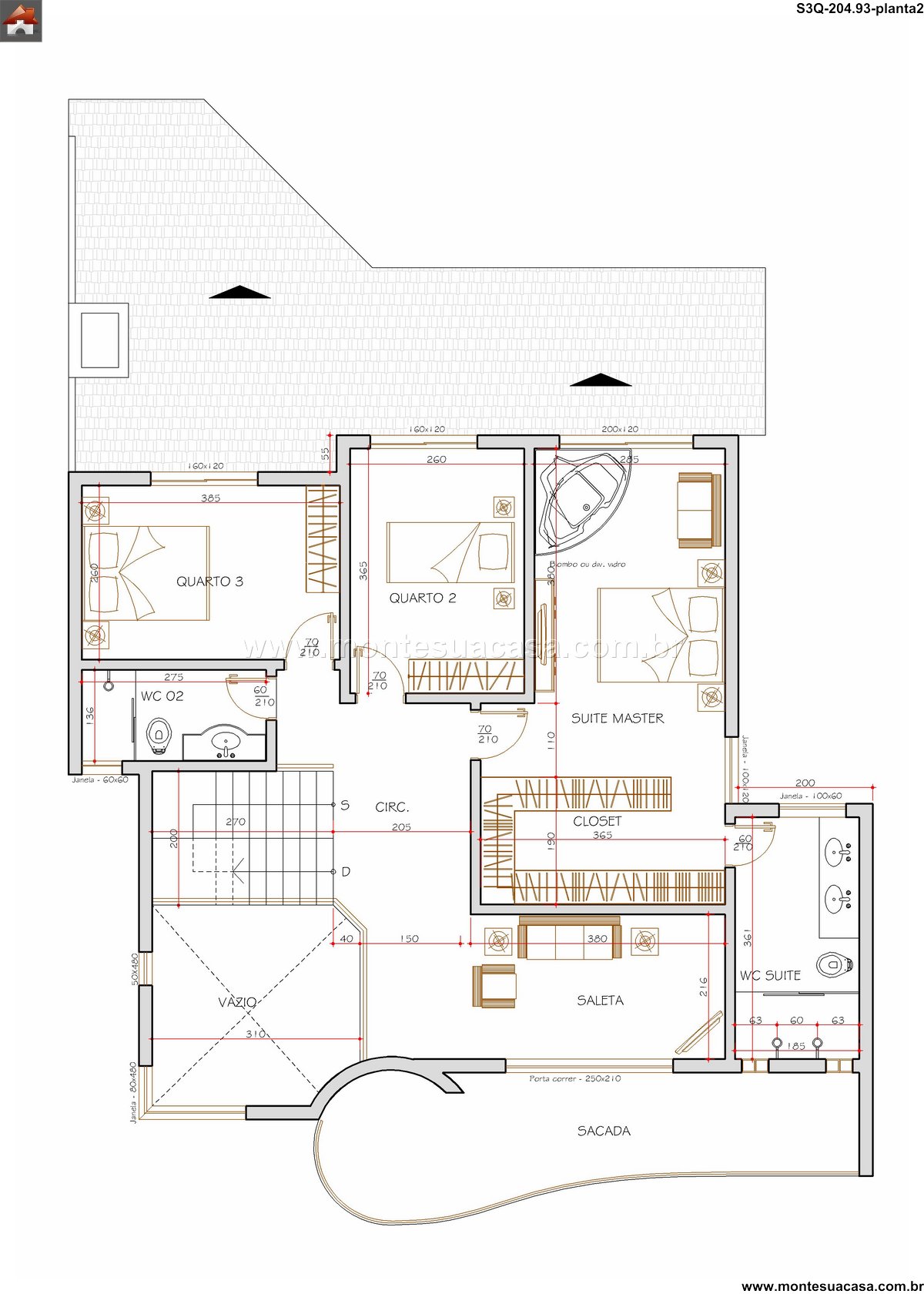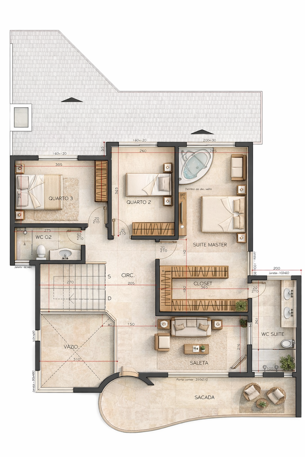 A zona íntima, abrigando os três quartos, foi estrategicamente posicionada para oferecer total privacidade e sossego. A suíte master se apresenta como um verdadeiro refúgio, incluindo um closet organizado e um banheiro com acabamentos de primeira linha. Os outros dois dormitórios também são generosos e compartilham um banheiro bem distribuído. Dessa forma, o projeto assegura conforto diário para todos os moradores, combinando praticidade com um design atemporal em cada quarto.