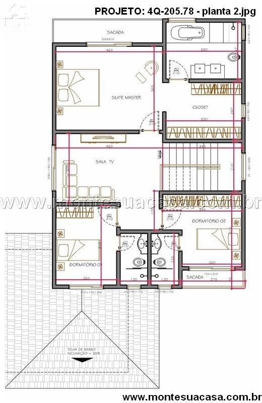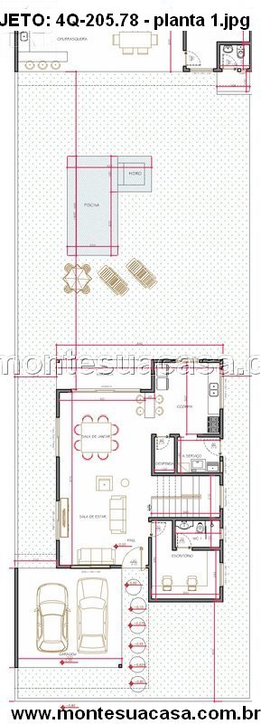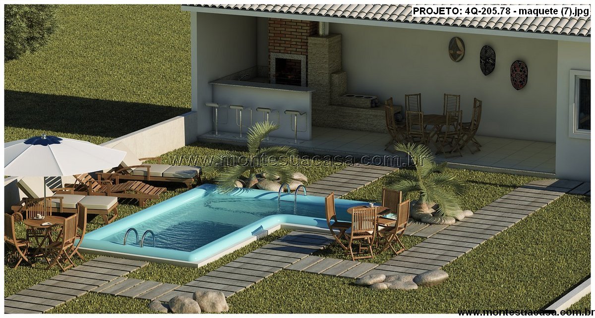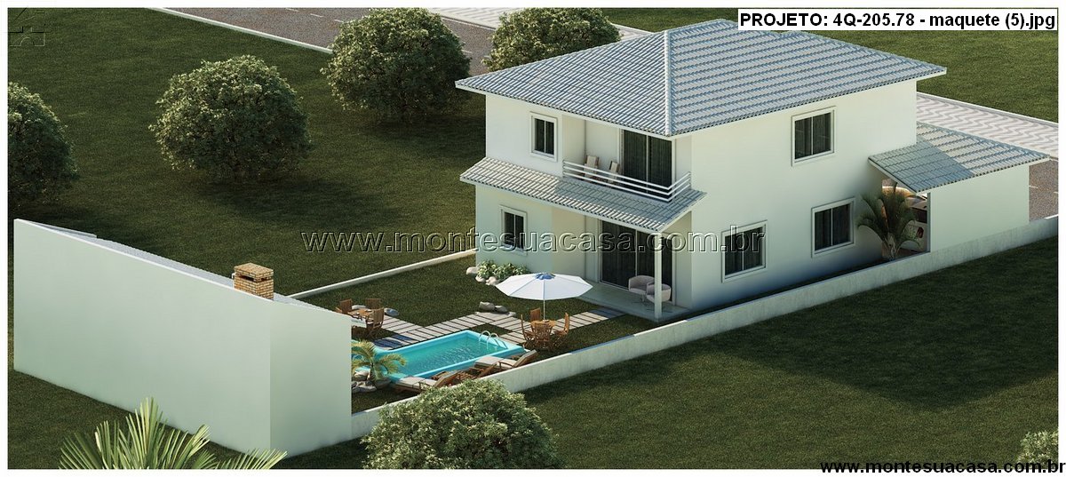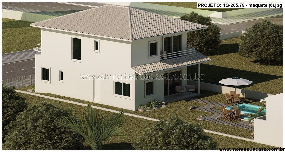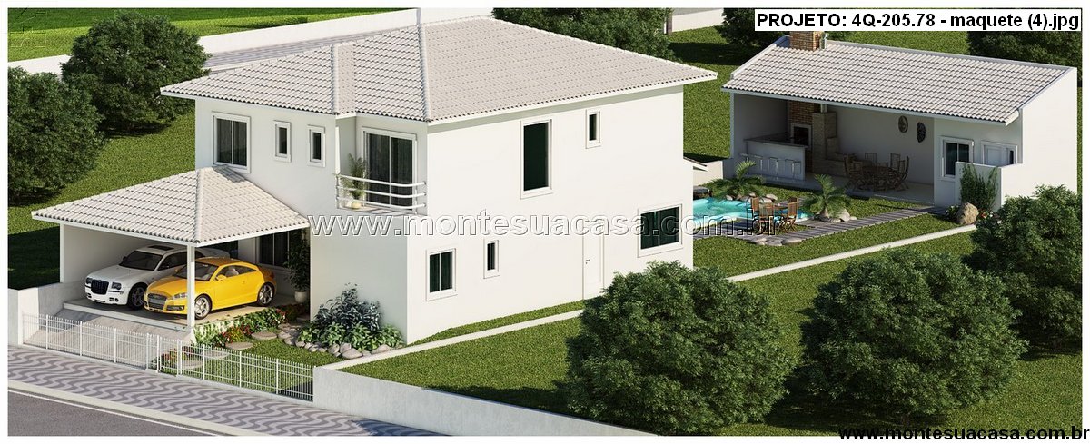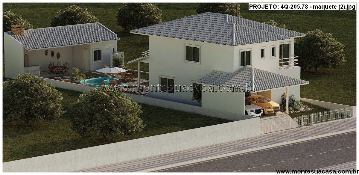 Projeto moderno com lazer completo e ambientes integrados Este projeto de 205,78m² apresenta uma residência contemporânea de dois pavimentos, ideal para famílias que valorizam conforto, funcionalidade e momentos de convivência. A fachada imponente combina telhado cerâmico com linhas retas e amplas aberturas, garantindo ventilação cruzada e iluminação natural em todos os ambientes.