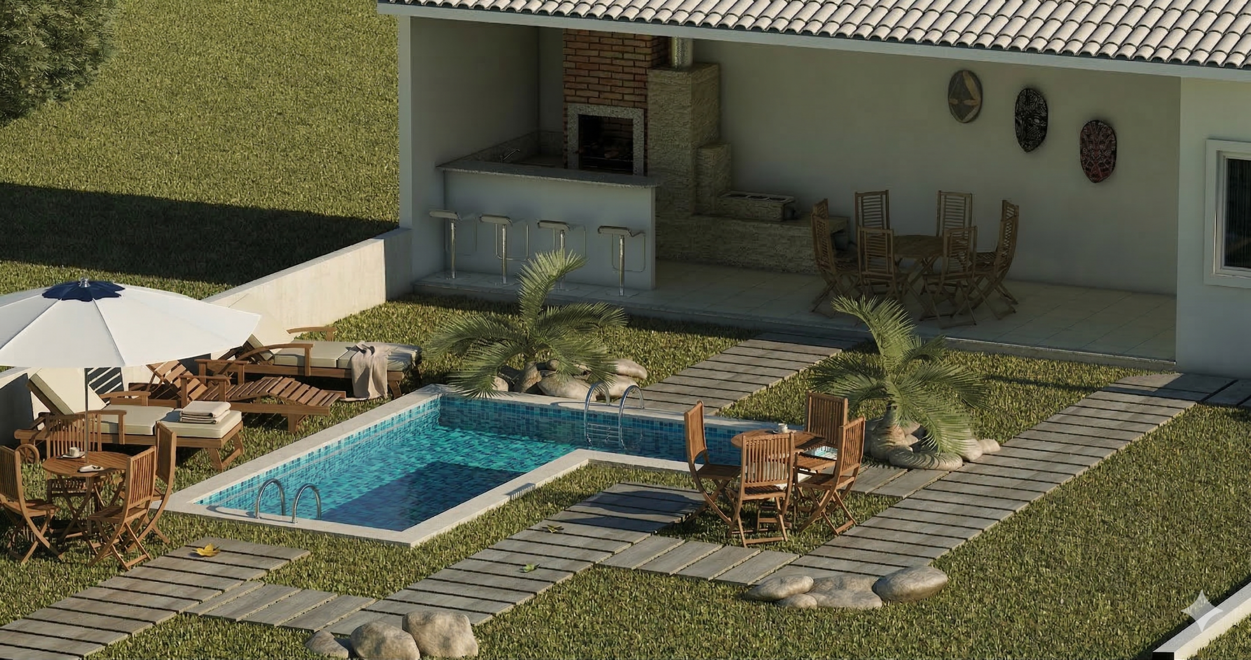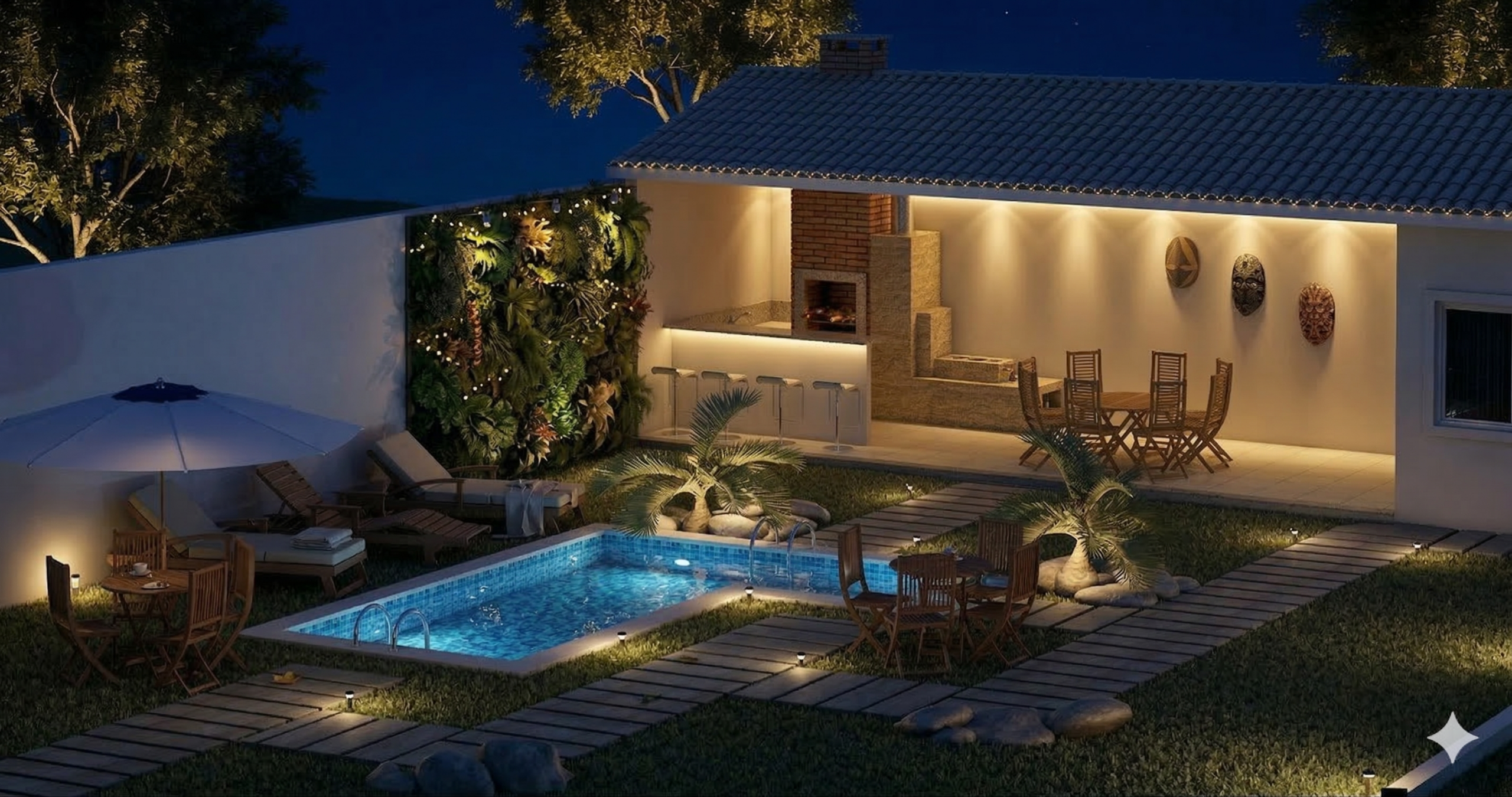 Área social ampla e conectada ao lazer No térreo, o destaque é a integração entre sala de estar, sala de jantar e cozinha, que se conectam diretamente à área externa. O quintal abriga uma piscina em formato L, cercada por deck de madeira, espreguiçadeiras e guarda-sóis. Ao lado, o espaço gourmet coberto conta com churrasqueira em alvenaria, bancada com banquetas e mesa de jantar, criando o ambiente perfeito para receber amigos e familiares.