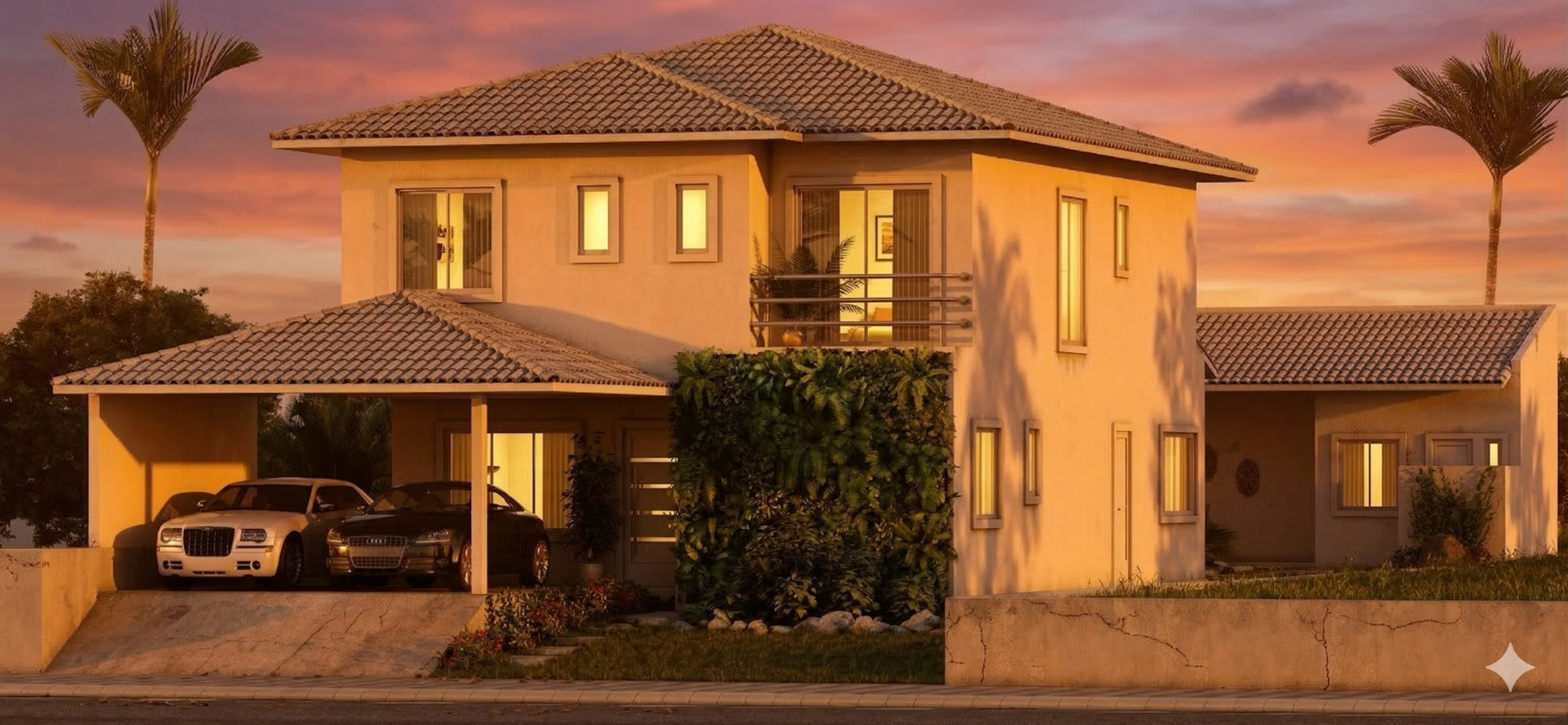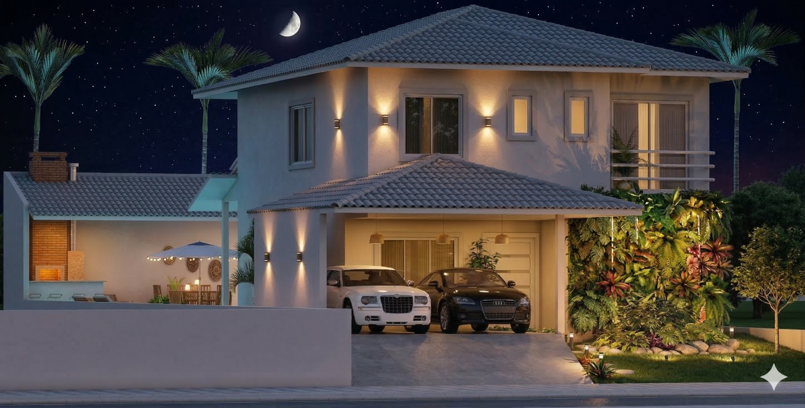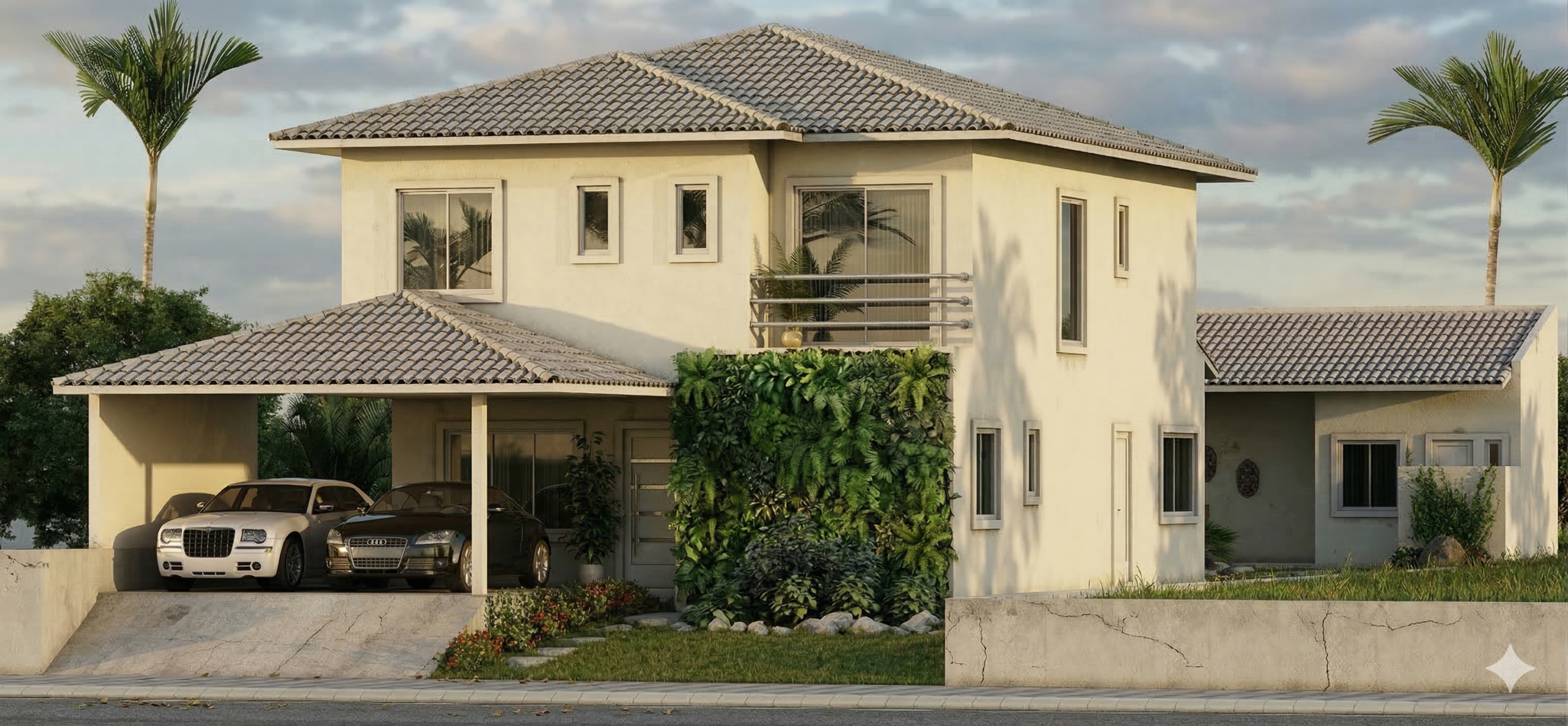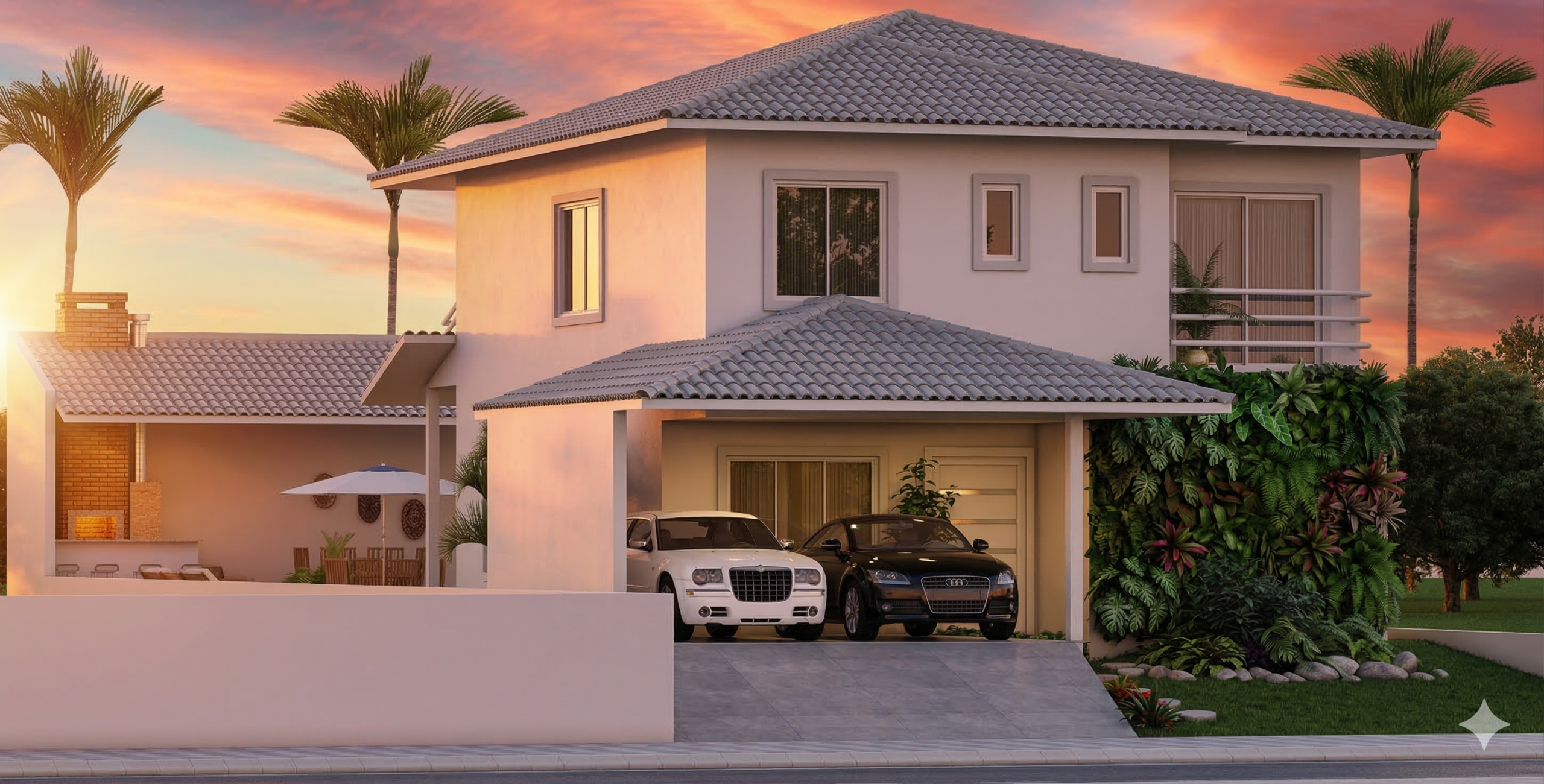 Garagem e entrada funcional A garagem coberta comporta dois veículos e está posicionada estrategicamente ao lado da entrada principal. O acesso é facilitado por caminhos em pedra e paisagismo com palmeiras e gramado, que valorizam a estética tropical do terreno.