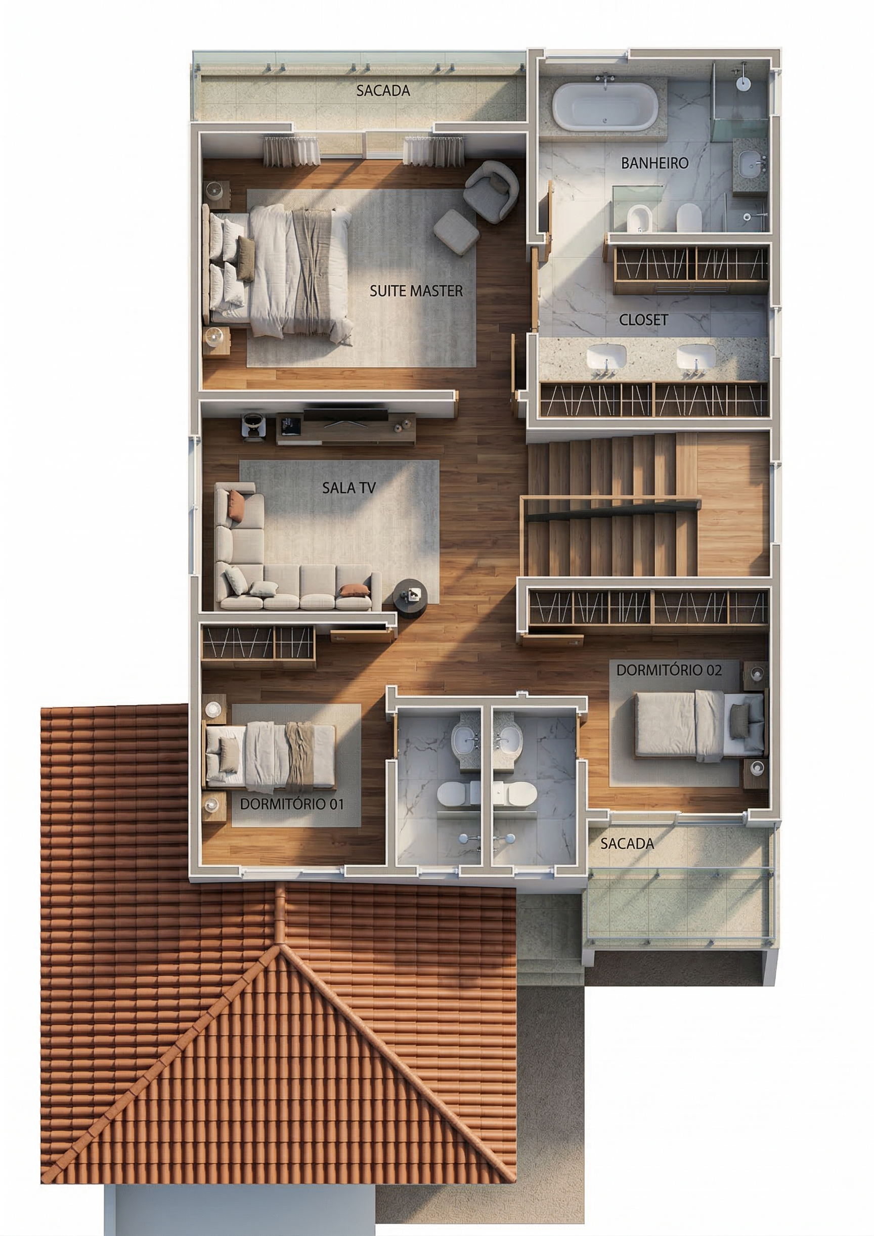 Pavimento superior com privacidade e conforto No andar superior, a suíte master se destaca por incluir closet, banheiro com banheira e acesso à sacada privativa. Dois dormitórios adicionais compartilham um banheiro social, enquanto a sala de TV oferece um espaço íntimo para descanso. Outro dormitório possui sacada própria, ampliando a sensação de espaço e conexão com o exterior.