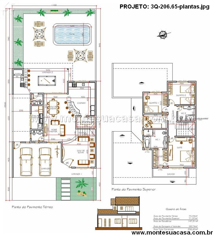 Este projeto de 206,65m² oferece uma solução arquitetônica completa para famílias que valorizam conforto, integração e estética contemporânea. Com dois pavimentos bem distribuídos, a planta contempla ambientes sociais amplos no térreo e uma área íntima reservada no pavimento superior.