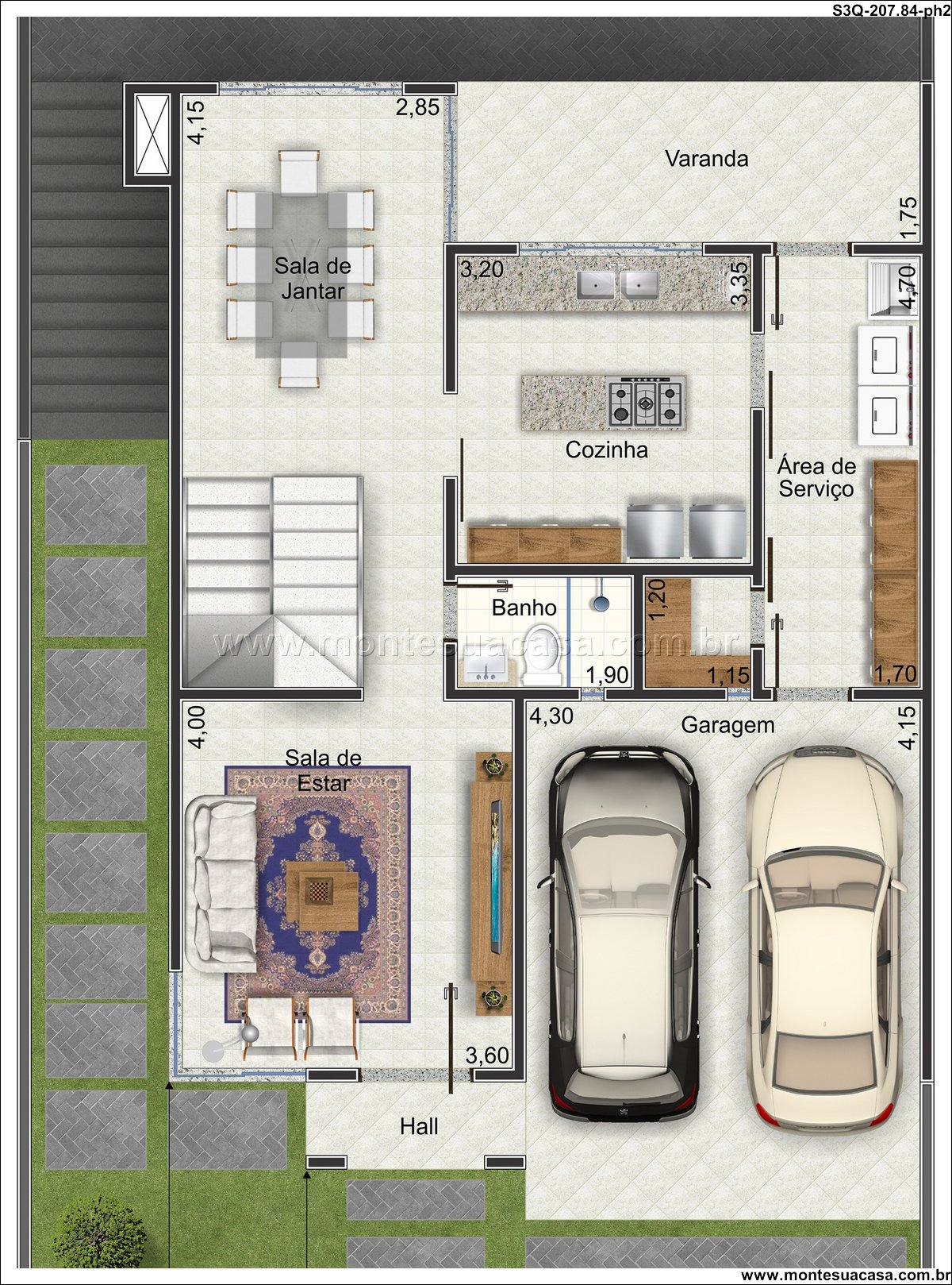 A socialização é privilegiada no pavimento de entrada, que abriga uma ampla sala de estar e jantar integradas à cozinha gourmet. Este espaço fluido abre-se para uma varanda, criando uma área de entretenimento perfeita para receber amigos e familiares. A cozinha, com 4,00m², foi projetada com ilha central e possui fácil acesso à área de serviço, priorizando a funcionalidade no dia a dia. Um banheiro social completo e um hall de entrada organizam a circulação, garantindo privacidade aos demais cômodos.