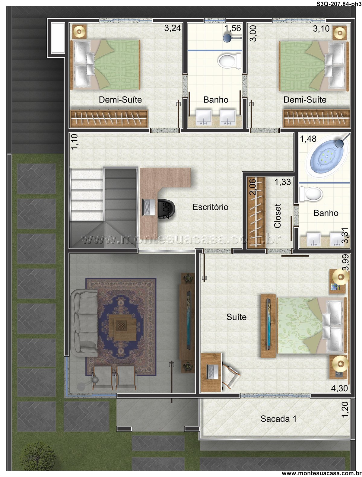 O pavimento superior é um verdadeiro refúgio privativo, abrigando três quartos, sendo duas demi-suítes e uma suíte master. A suíte master, com generosos 4,30m², inclui um closet organizado e um banheiro espaçoso. As demi-suítes compartilham um banheiro bem distribuído, atendendo com conforto aos filhos ou hóspedes. Destaque para o escritório, um ambiente de 2,06m² que oferece um cantinho silencioso para o trabalho ou estudos, adjacente a um closet adicional que amplia as opções de armazenamento.