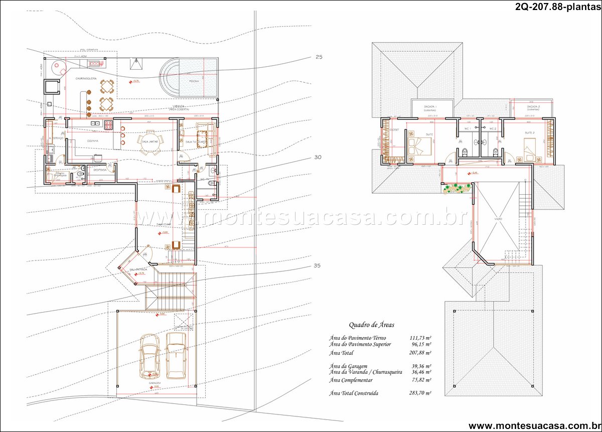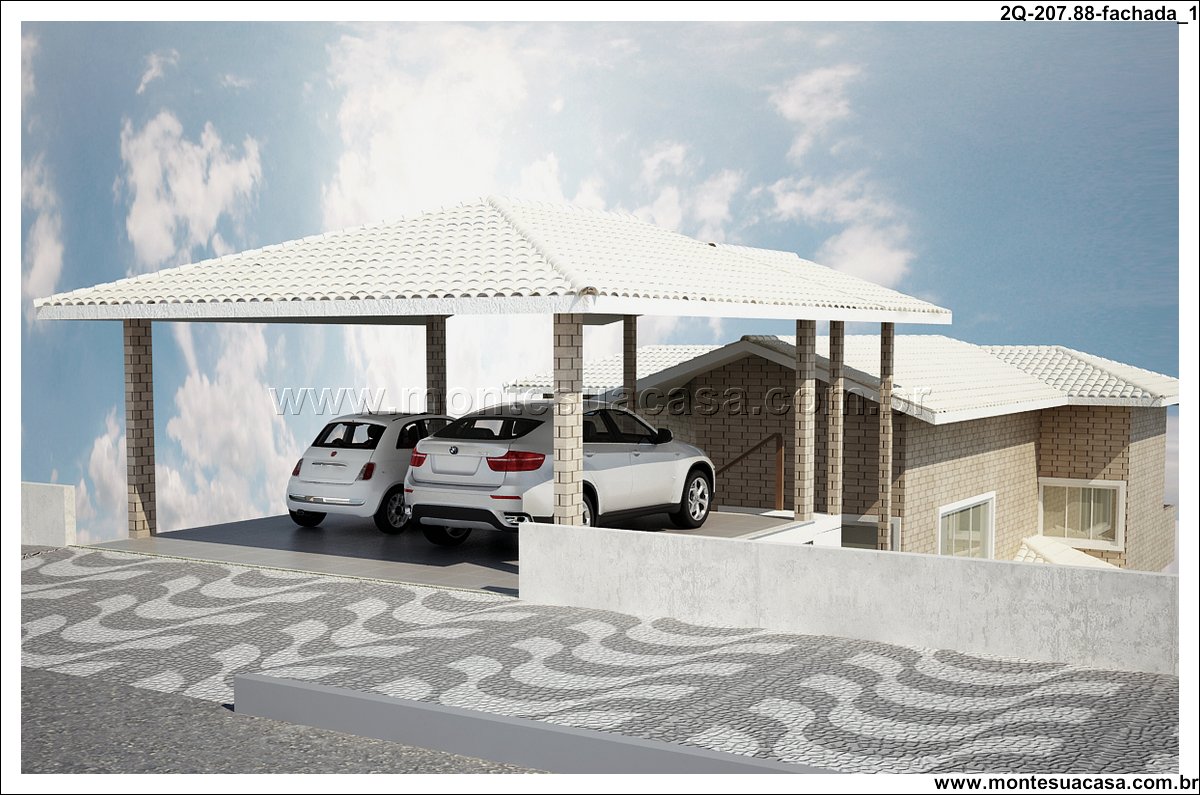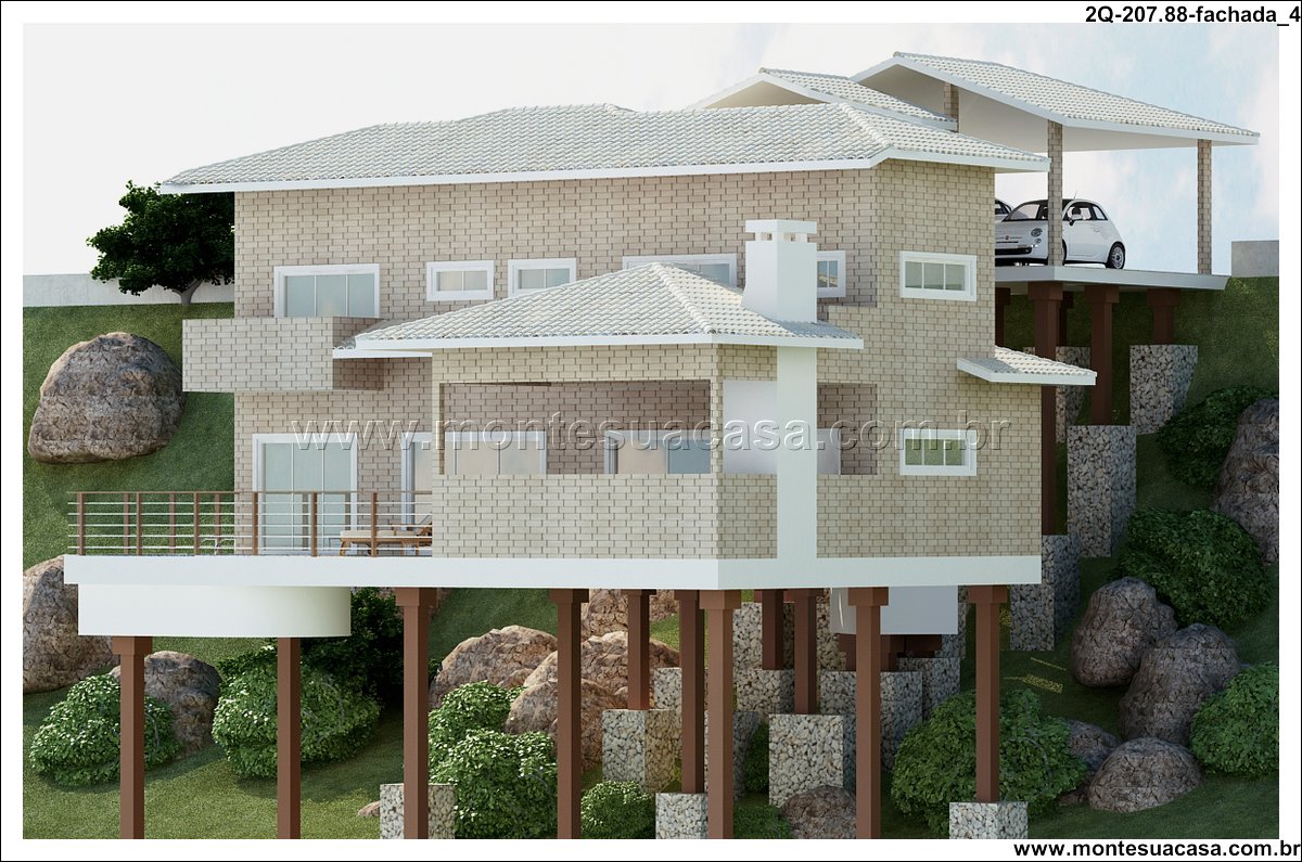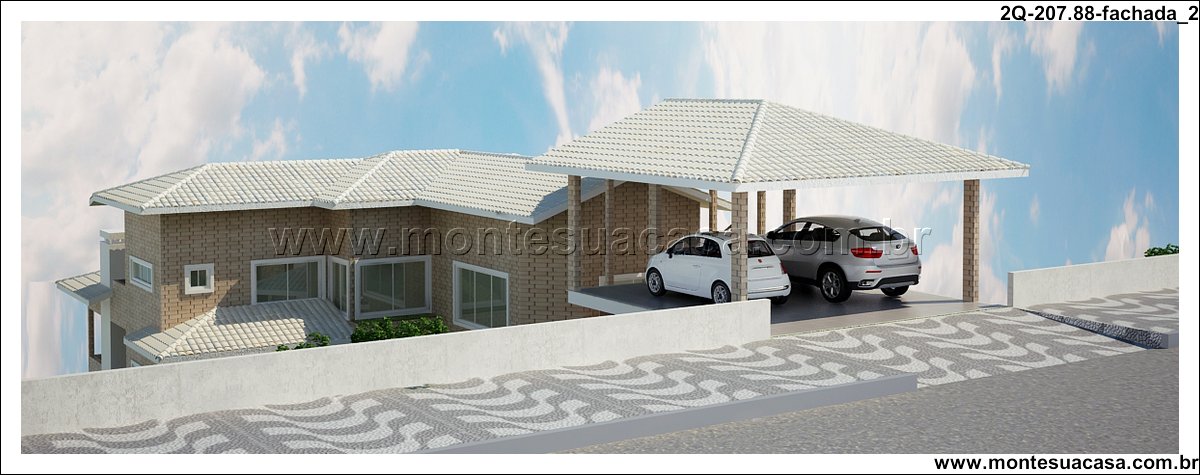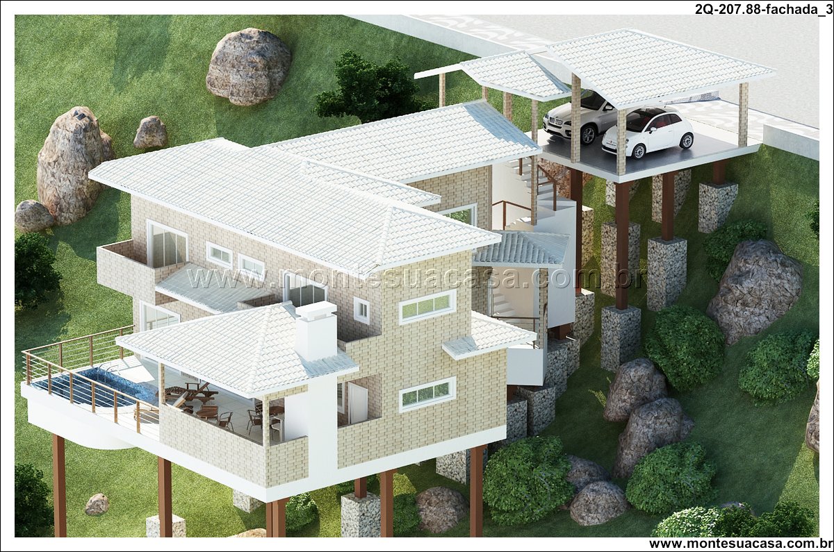 Projeto ideal para terrenos em declive acentuado Este projeto foi desenvolvido especialmente para terrenos em declive, aproveitando a inclinação natural para criar uma residência moderna, funcional e visualmente impactante. A entrada principal se dá pelo nível superior, onde está localizado o carport coberto para dois veículos. Essa solução facilita o acesso e valoriza a fachada com elementos contemporâneos como telhado branco, grandes aberturas e revestimento em tijolos claros.